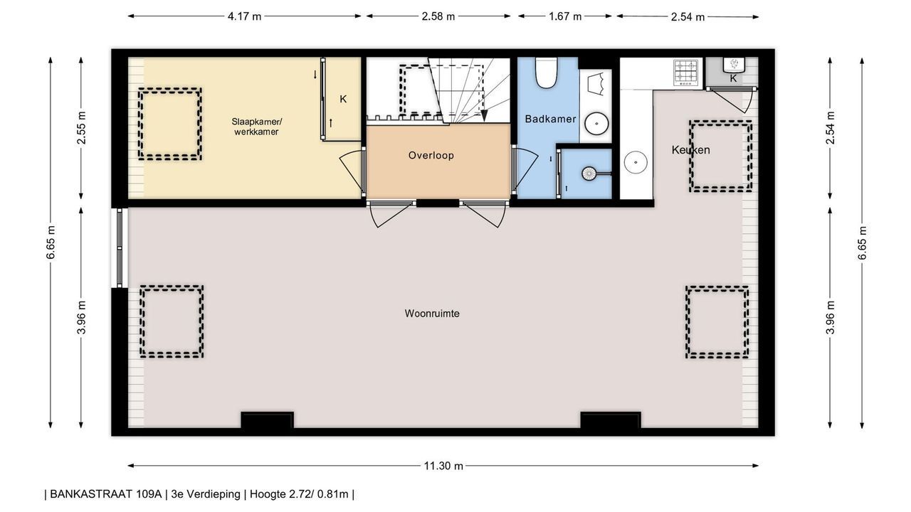 Trap naar derde verdieping. Overloop, ruime voorslaapkamer, nette badkamer met w.c., wastafelmeubel en inloopdouche. Heerlijke open ruimte met voor-/en achterkamer, open nette eenvoudige keuken en opstelplaats C.V.-ketel. Speelse en charmante raampartij aan de voorzijde met eveneens de vrije doorkijk door de Billitonstraat.