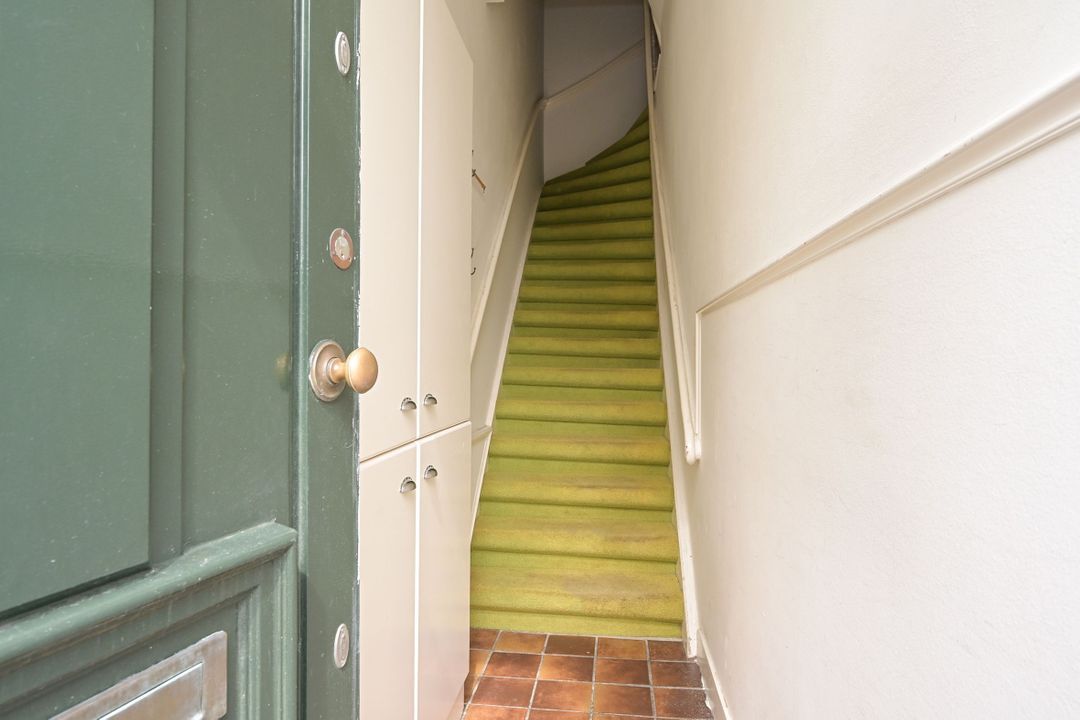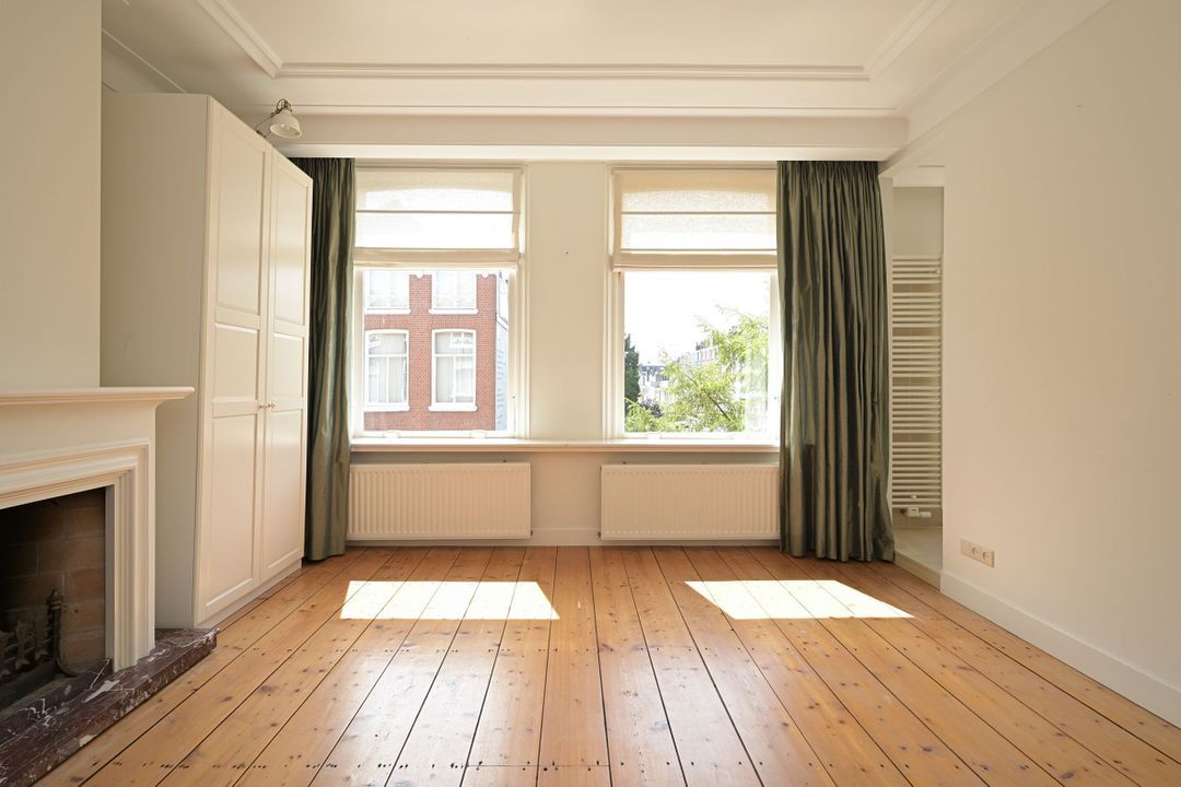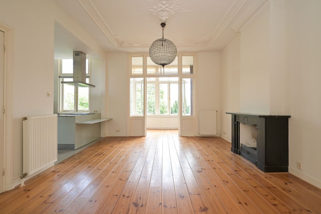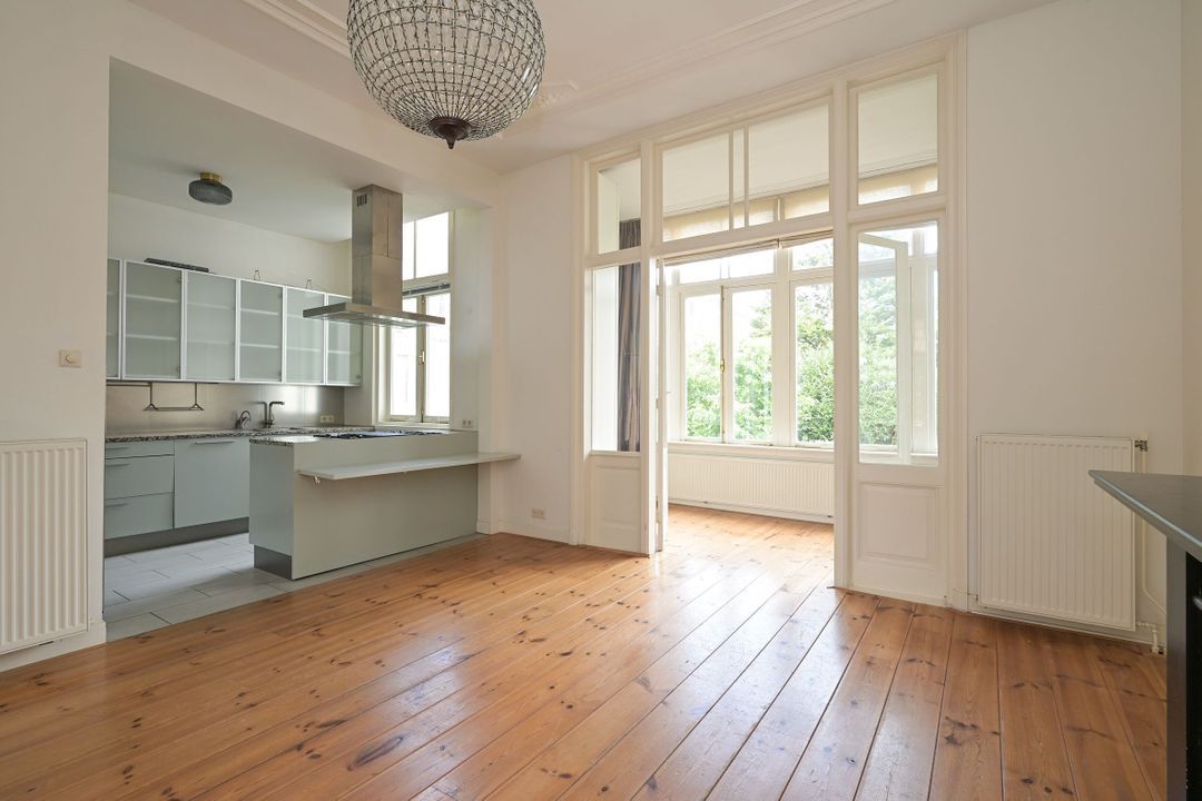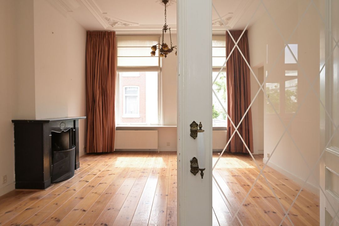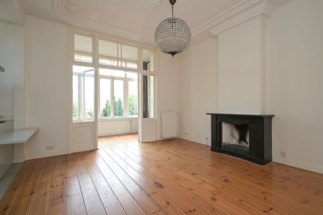 Entree op straatniveau. Trap naar de 1e etage, overloop met houten vloer en doorloop naar kamers-en-suite met schuifseparatie en vaste kasten, doorgang naar voorzijkamer. De ruimtes hebben een houten vloer, een schouw en mooie ornamenten-plafonds. Aan de achterkamer grenst een zeer lichte serre, ideaal als werkplek of kinderspeelruimte. Open keuken met inbouwapparatuur (vaatwasser, oven, 6-pitsgasfornuis, losse koel-/vriescombinatie, afzuigkap). Op de overloop bevindt zich een separate moderne wc met fonteintje.