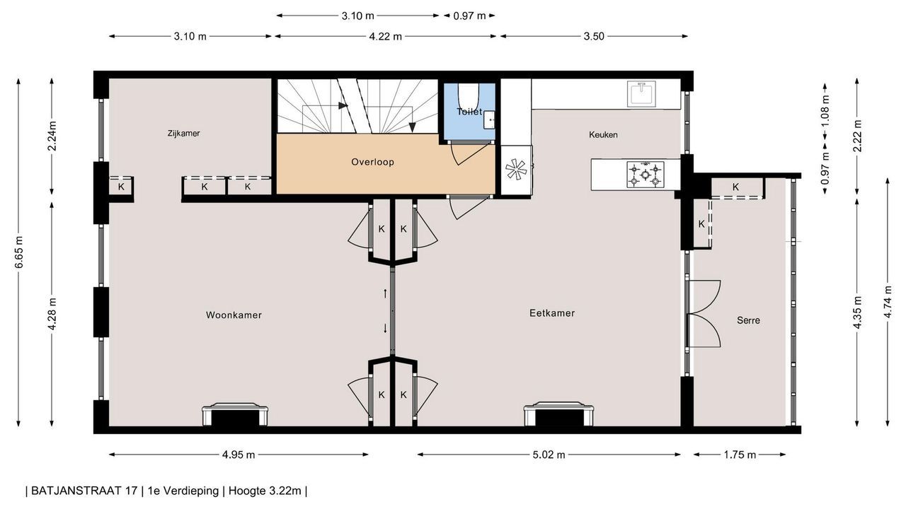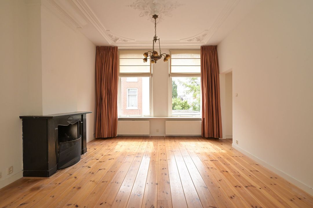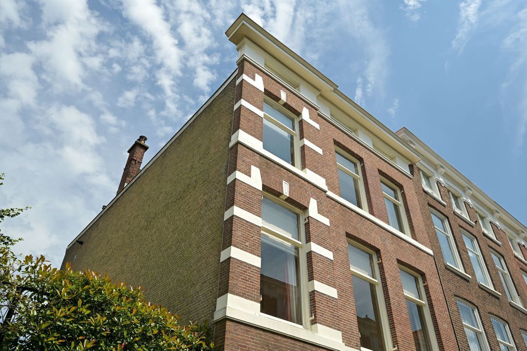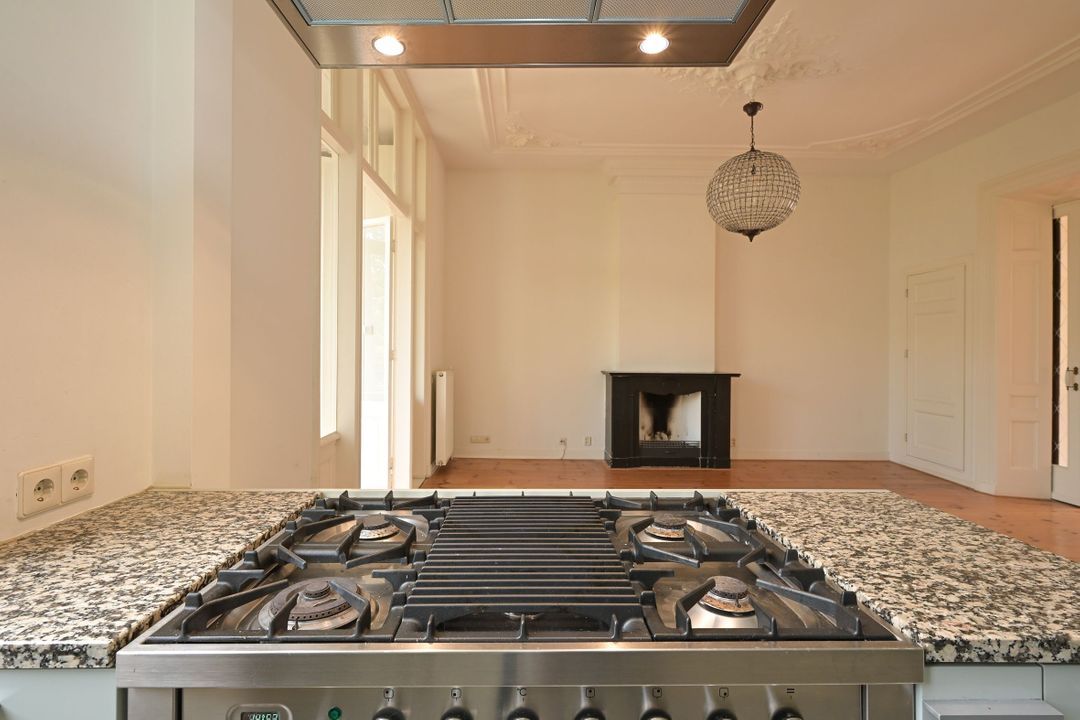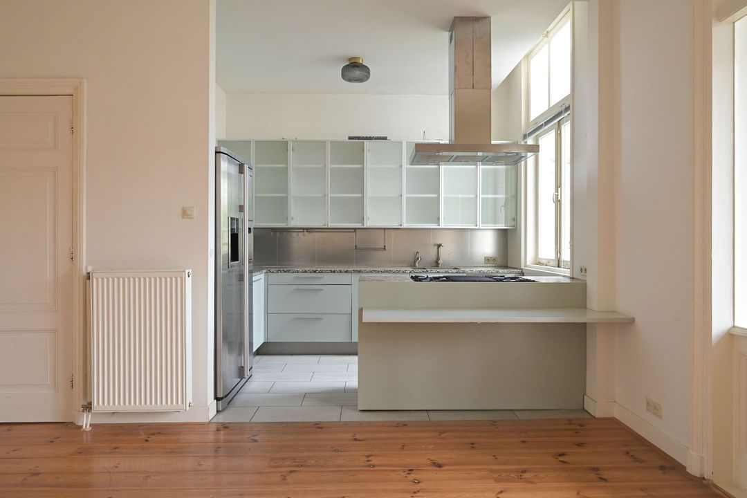 Entree op straatniveau. Trap naar de 1e etage, overloop met houten vloer en doorloop naar kamers-en-suite met schuifseparatie en vaste kasten, doorgang naar voorzijkamer. De ruimtes hebben een houten vloer, een schouw en mooie ornamenten-plafonds. Aan de achterkamer grenst een zeer lichte serre, ideaal als werkplek of kinderspeelruimte. Open keuken met inbouwapparatuur (vaatwasser, oven, 6-pitsgasfornuis, losse koel-/vriescombinatie, afzuigkap). Op de overloop bevindt zich een separate moderne wc met fonteintje.