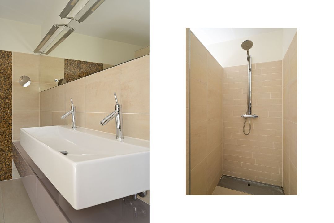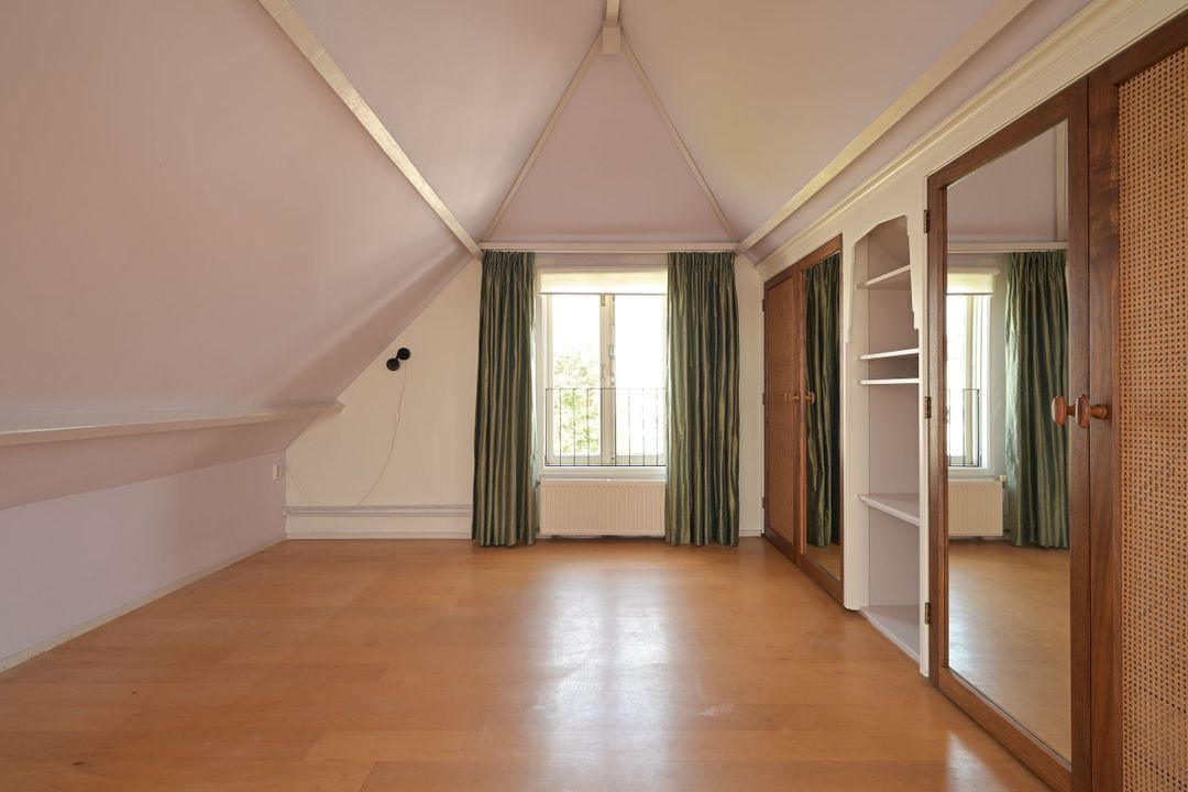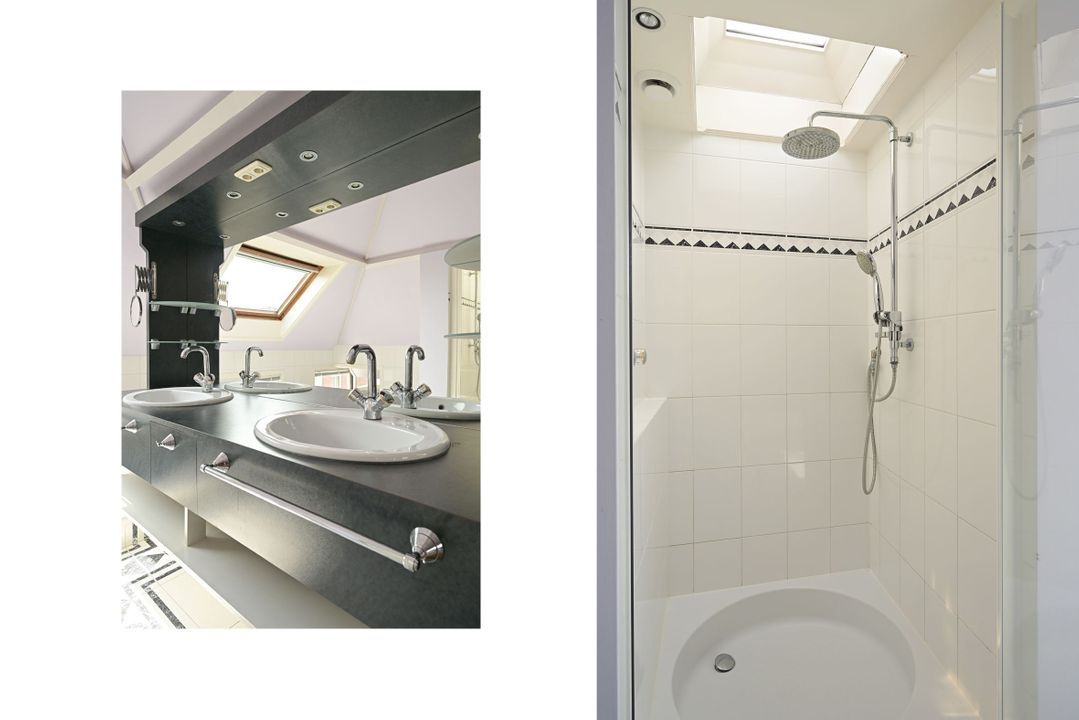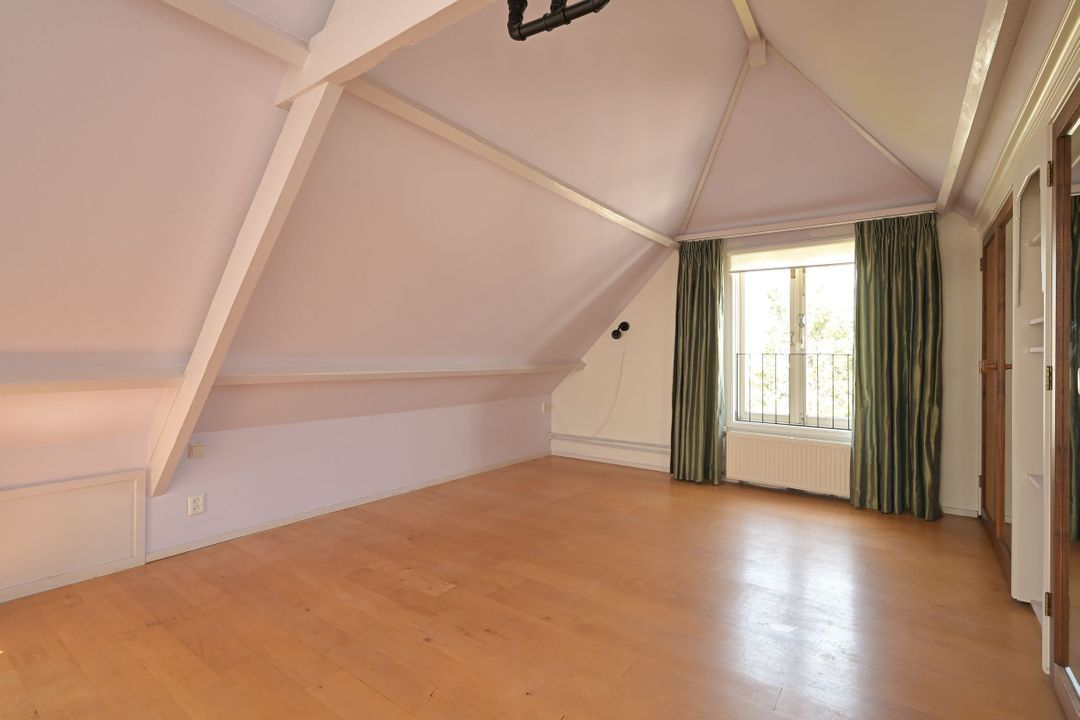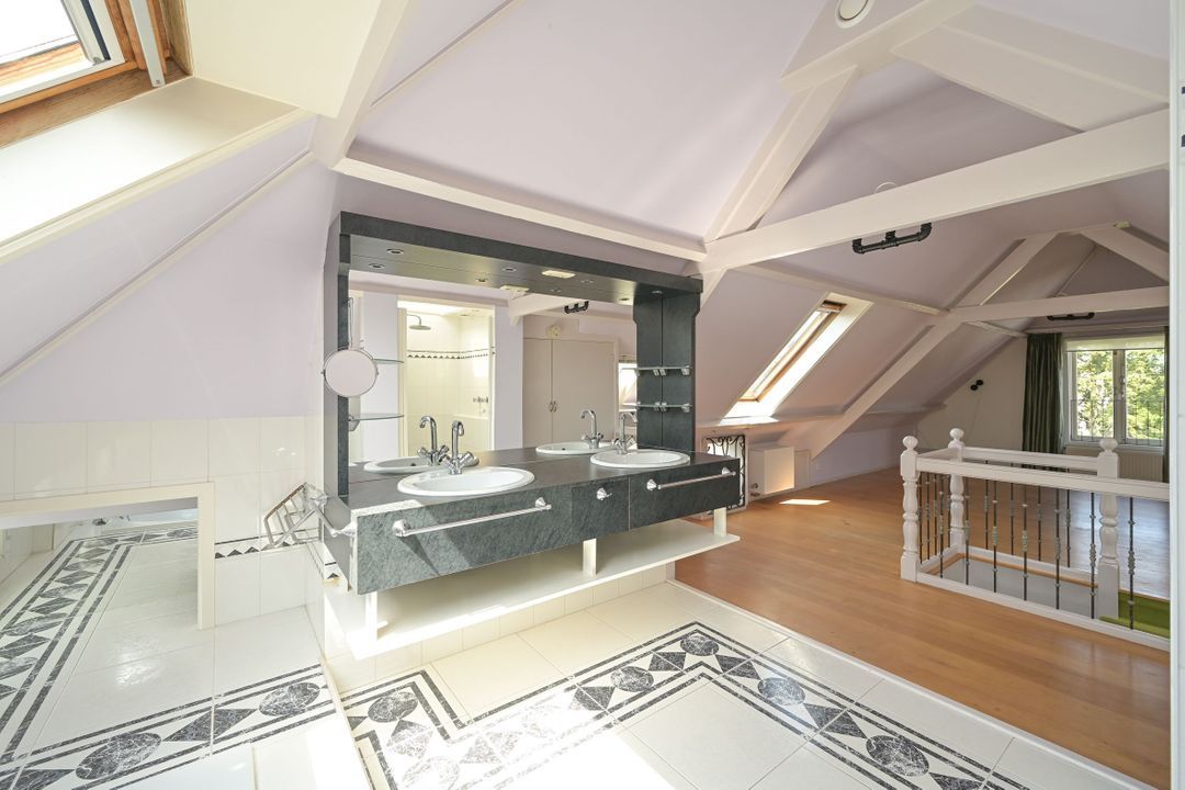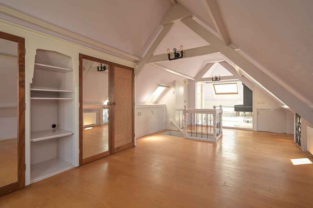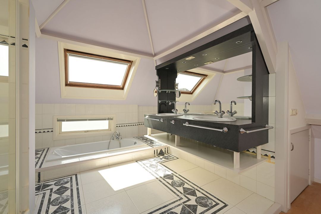 Trap naar de 3e etage: zeer ruime loft-achtige slaapkamer met veel kasten en open moderne badkamer met ligbad, inloopdouche en wastafelmeubel. Veel bergruimte in de kap.