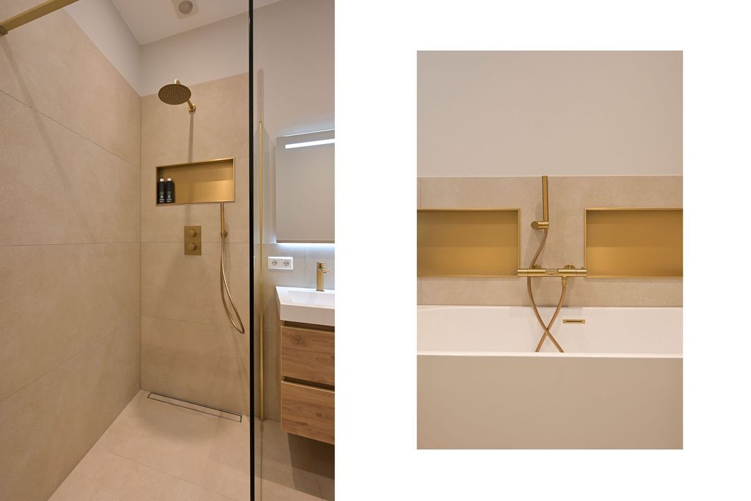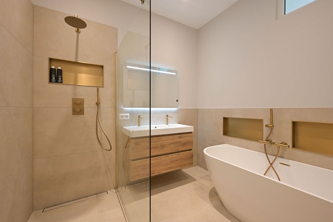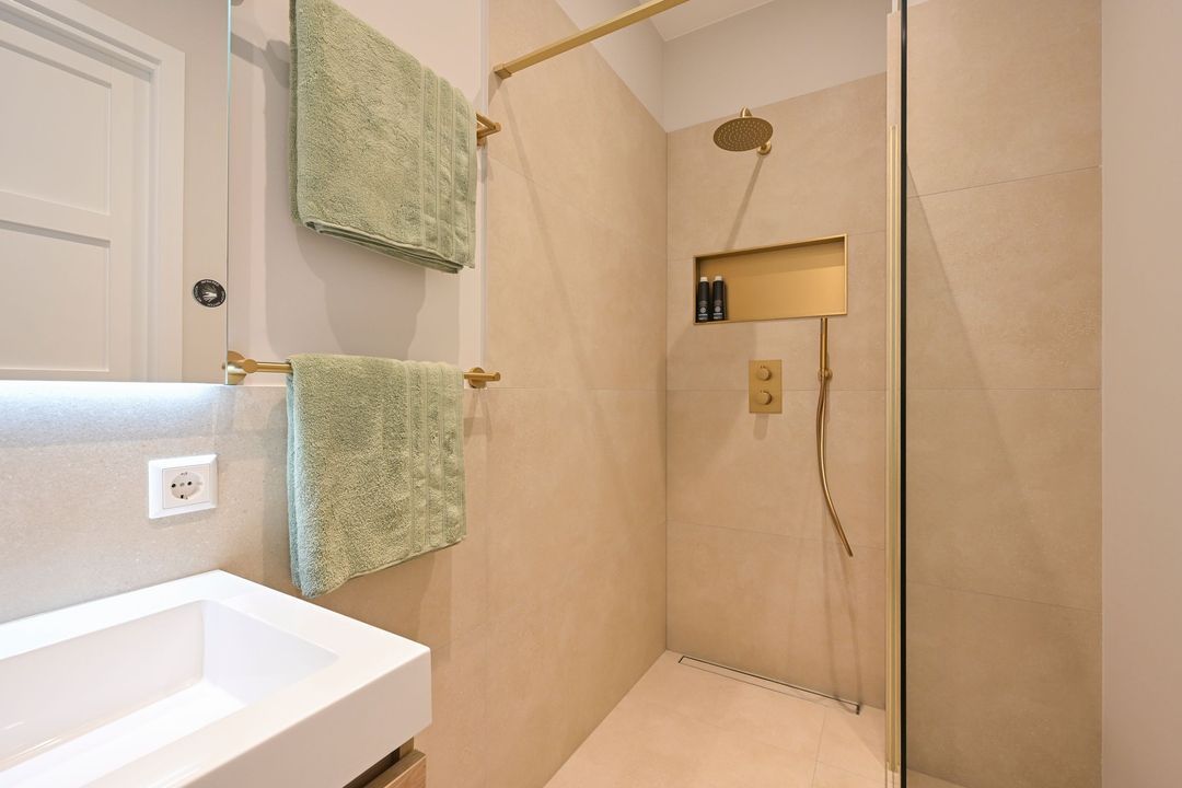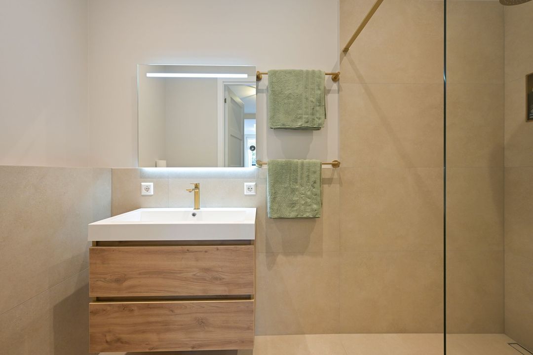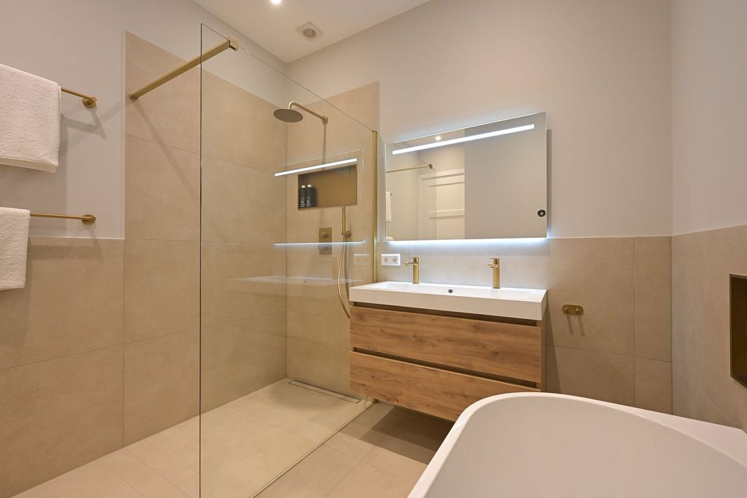 Aan de gang naast slaapkamer 1 bevindt zicht de grote moderne betegelde badkamer met ligbad, ruime inloopdouche, dubbel wastafelmeubel en vloerverwarming. Naast deze badkamer een seprate WC ruimte met wandcloset en fonteintje.