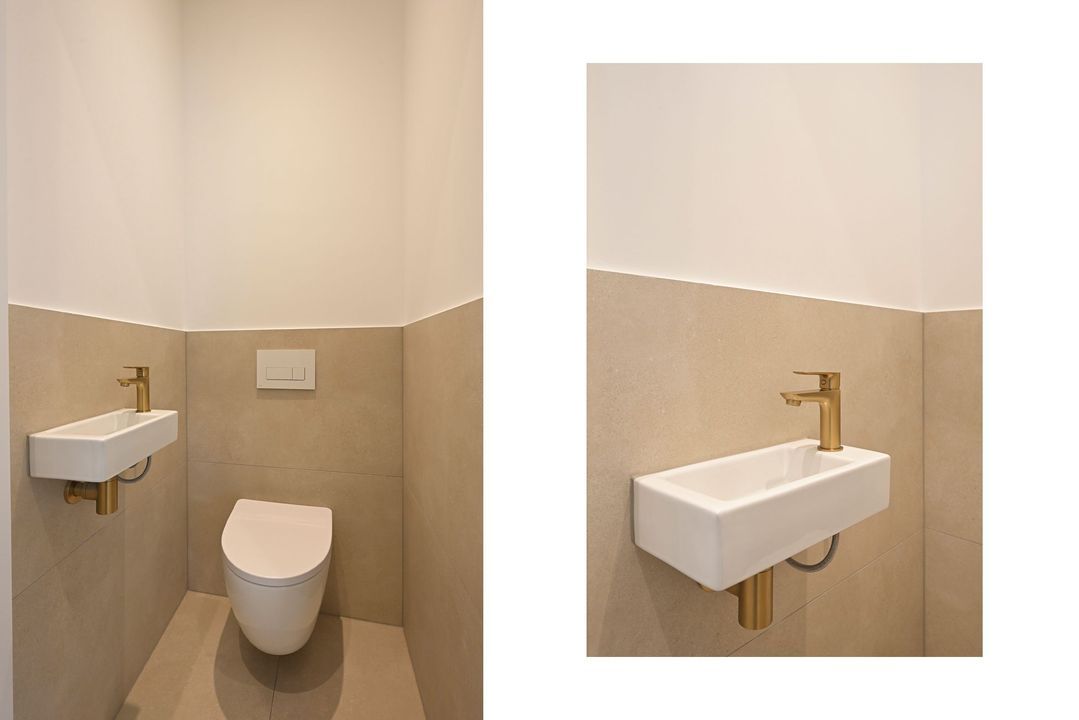 Next to this bathroom is a separate toilet with wall-mounted toilet and washbasin.