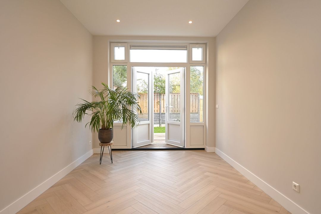 Glazen openslaande deur naar de royale living met aan de voorzijde de brede woonkamer met grote raampartij.