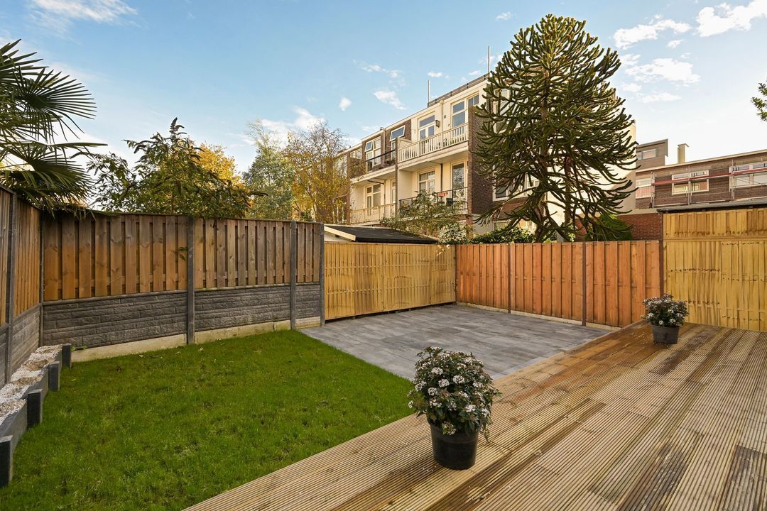 Aan de achterzijde de eetkamer met daklicht en openslaande deuren naar de brede en diepe achtertuin met vlonders, gras en tegels.