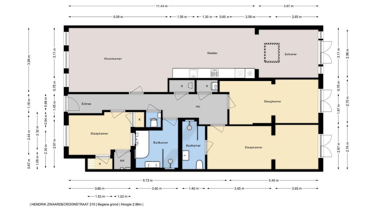 Entree via voordeur naar lange centrale hal, met toegang tot alle overige vertrekken .
