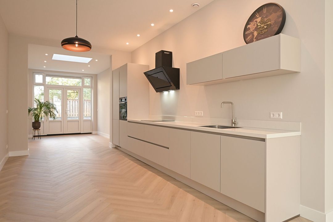 Tussen de woonkamer en eetkamer staat de moderne open keuken. Deze kwaliteitskeuken met veel bergruimte is voorzien van een composiet werkblad en diverse Siemens inbouwapparatuur zoals vaatwasser, koel/vries combinatie oven en 4-pits inductie kookplaat.