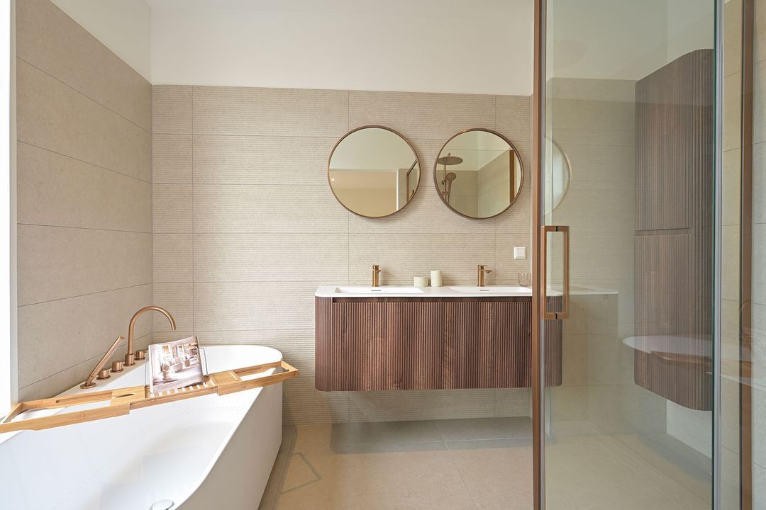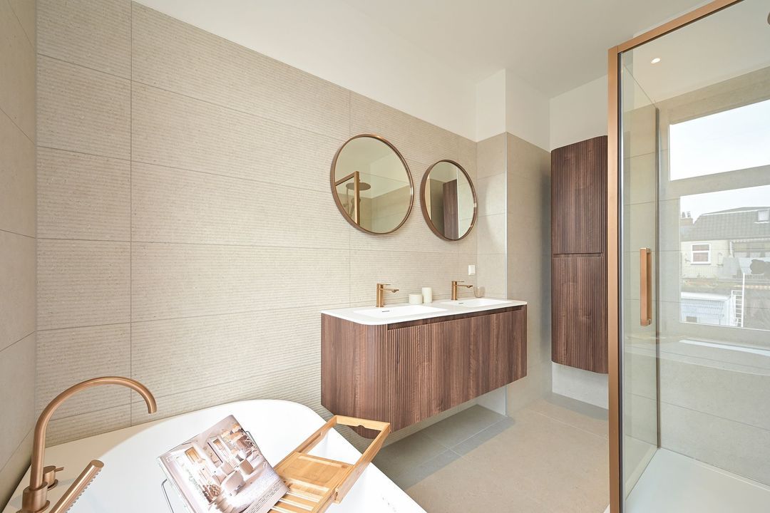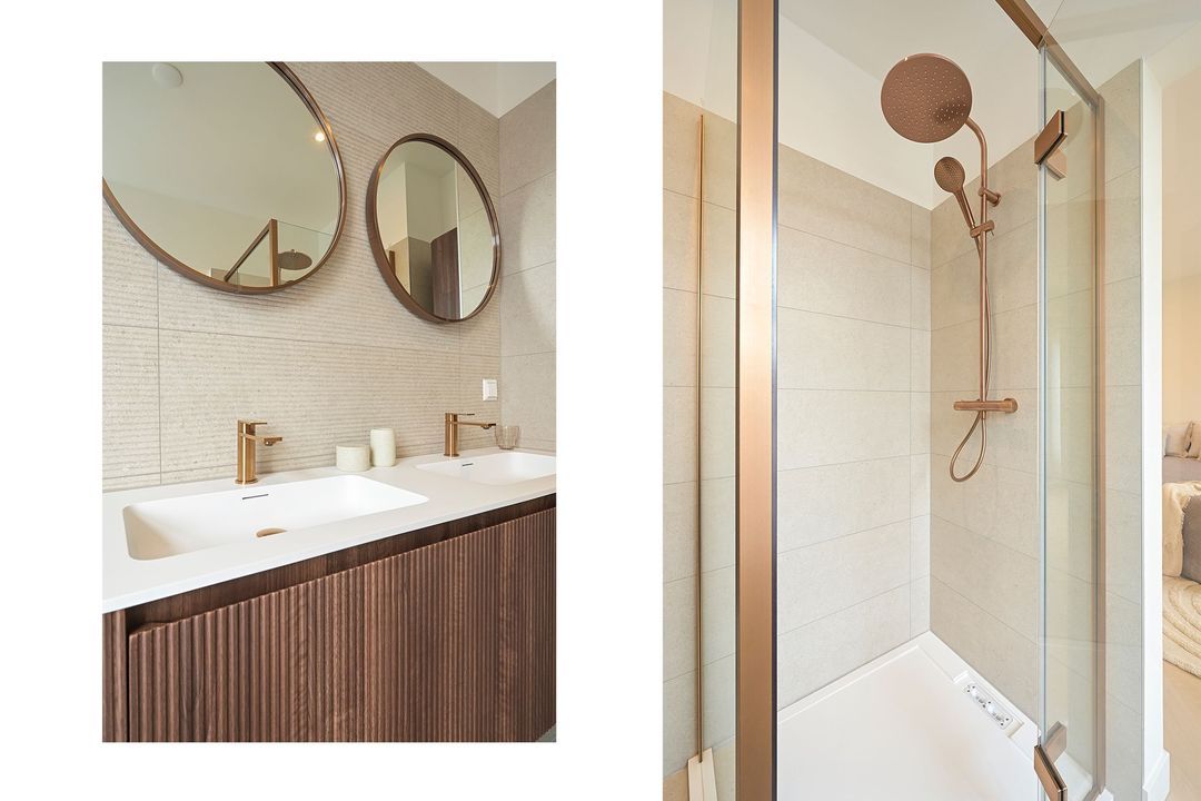 At the front, a modern bathroom with walk-in shower and washbasin vanity unit.