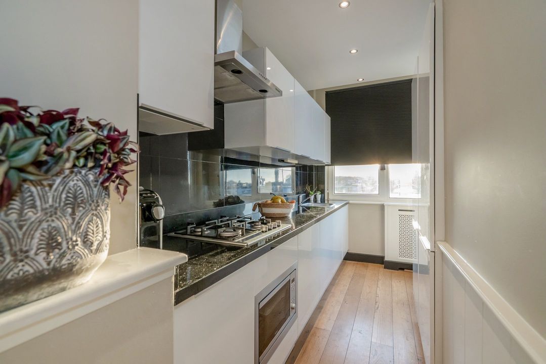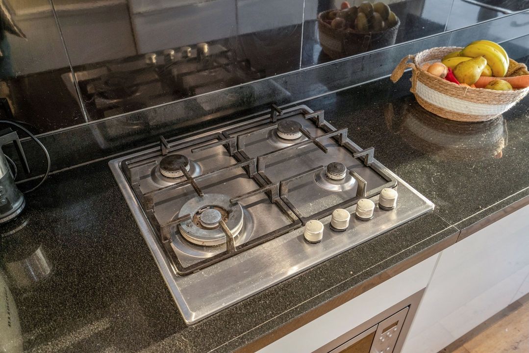 De moderne keuken aan de achterzijde is praktisch en compleet uitgerust met inbouwapparatuur, waaronder een koel-vriescombinatie, gaskookplaat en magnetron. Vanuit de keuken stap je zo het balkon op – perfect voor een kop koffie in de ochtendzon. Ook hier is extra bergruimte aanwezig.