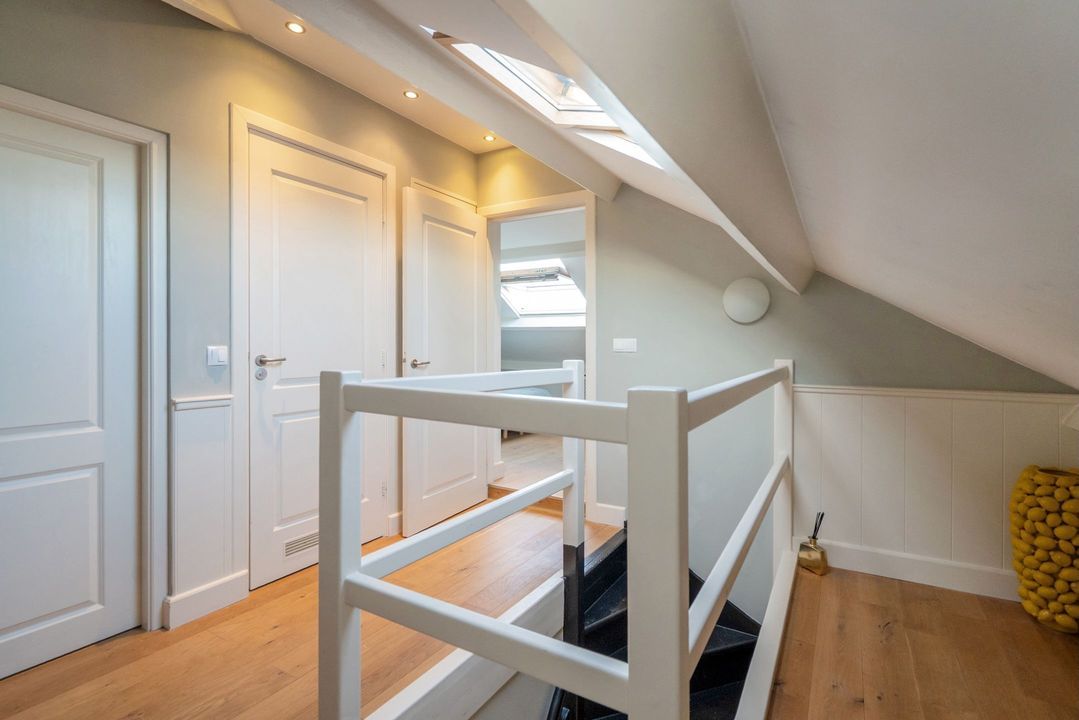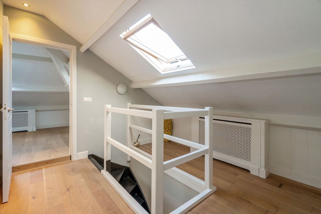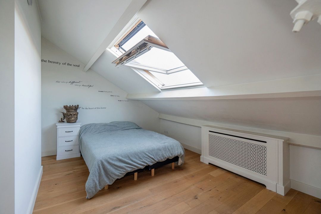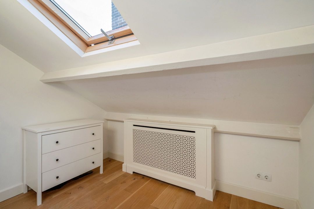 Via de vaste trap bereik je de zolderverdieping. Hier vind je een ruime overloop met dakraam en volop bergruimte. Aan de achterzijde ligt slaapkamer drie, terwijl aan de voorzijde een verrassend ruime vierde slaapkamer is met twee Velux dakramen. Tussen de slaapkamers in bevindt zich de moderne badkamer met douche en wastafel, evenals een aparte kast voor wasmachine en droger. Ook hier zorgen de houten vloeren voor een warme, huiselijke sfeer.