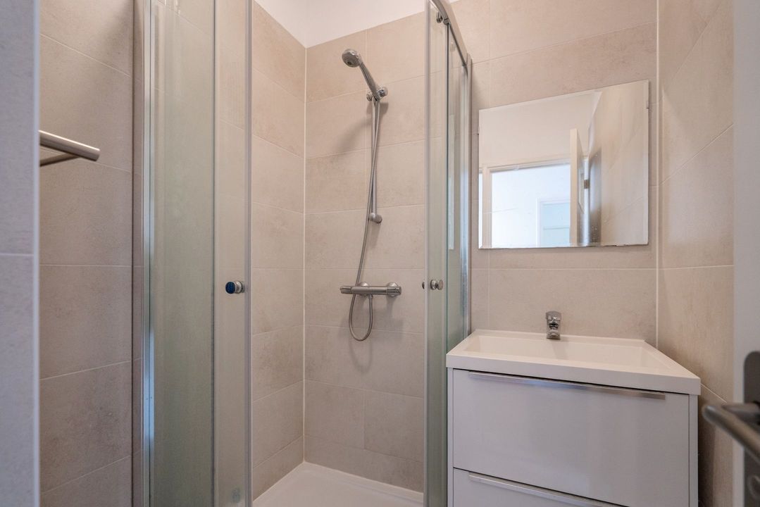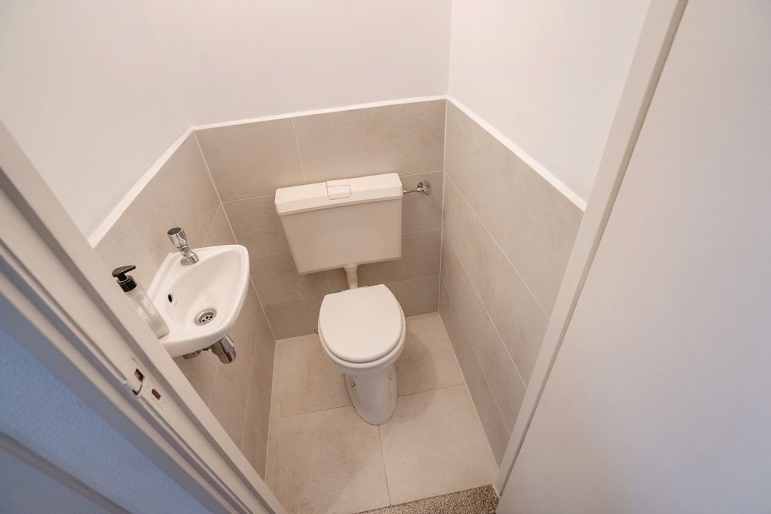 In de hal bevinden zich een net toilet met fonteintje en een moderne badkamer met douche en modern wastafelmeubel.