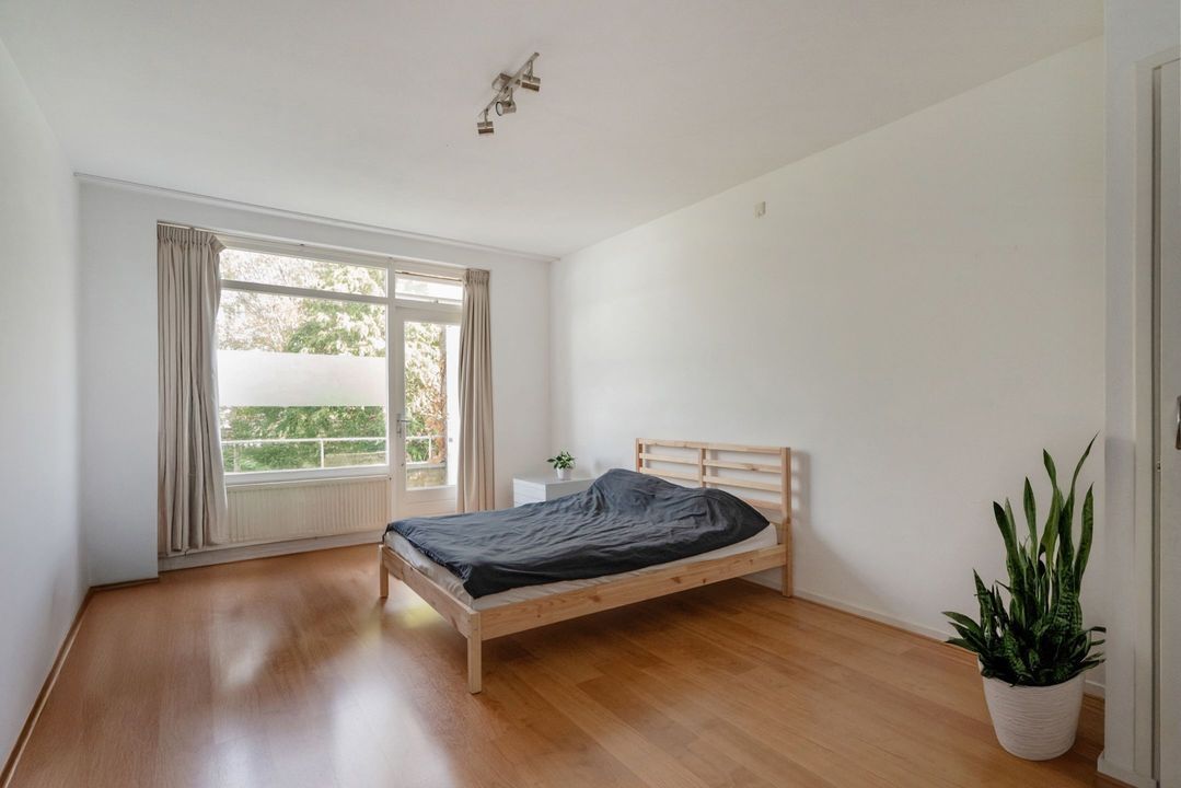 De ruime slaapkamer beschikt over een vaste kast en geeft toegang tot het achterbalkon dat zich uitstrekt over de gehele breedte van het appartement. Dit balkon is tevens bereikbaar vanuit de keuken en voorzien van een handige balkonkast.