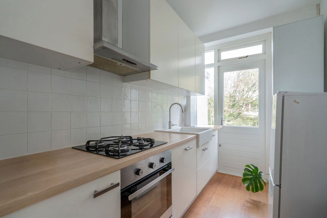 De keuken is uitgevoerd in een roomkleurig keukenblok met beuken aanrechtblad en voorzien van diverse inbouwapparatuur: gaskookplaat, afzuigkap en elektrische oven. Verder is er een losse koel-/vriescombinatie, aansluiting voor de wasmachine en een vaste kast met daarin de geiser.
