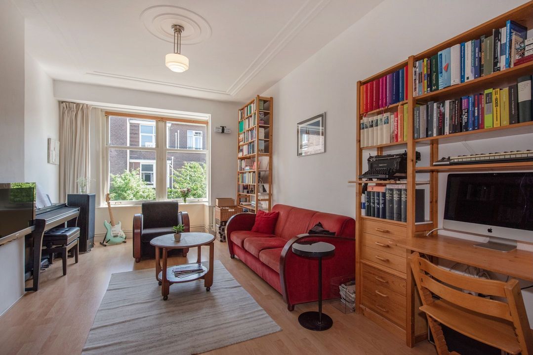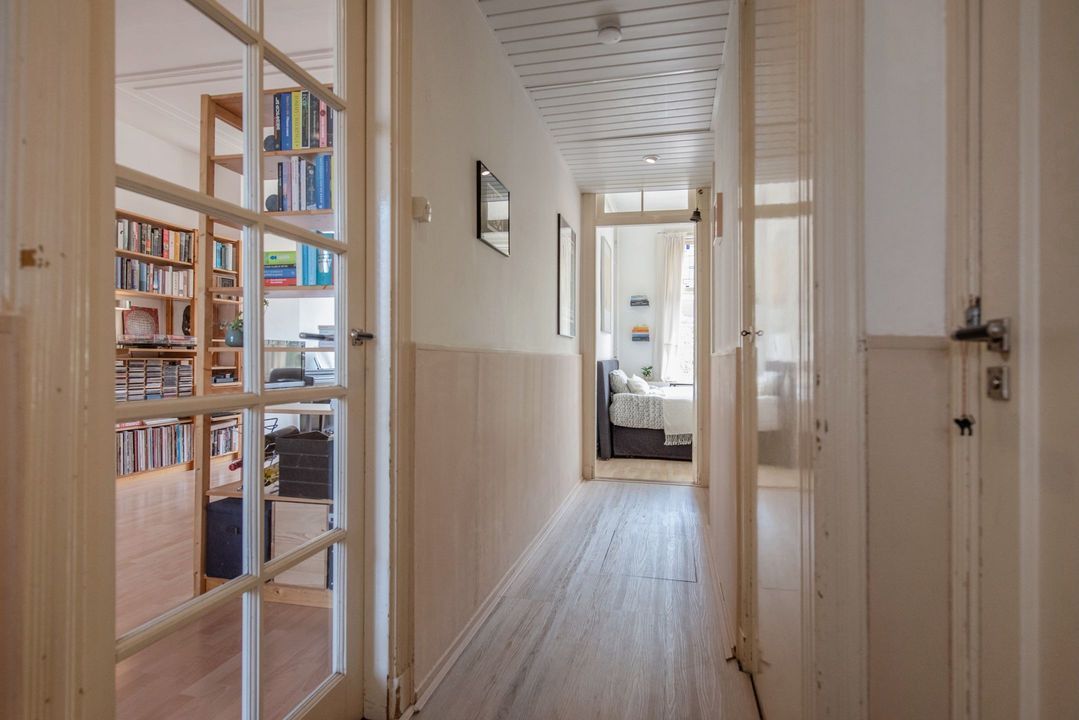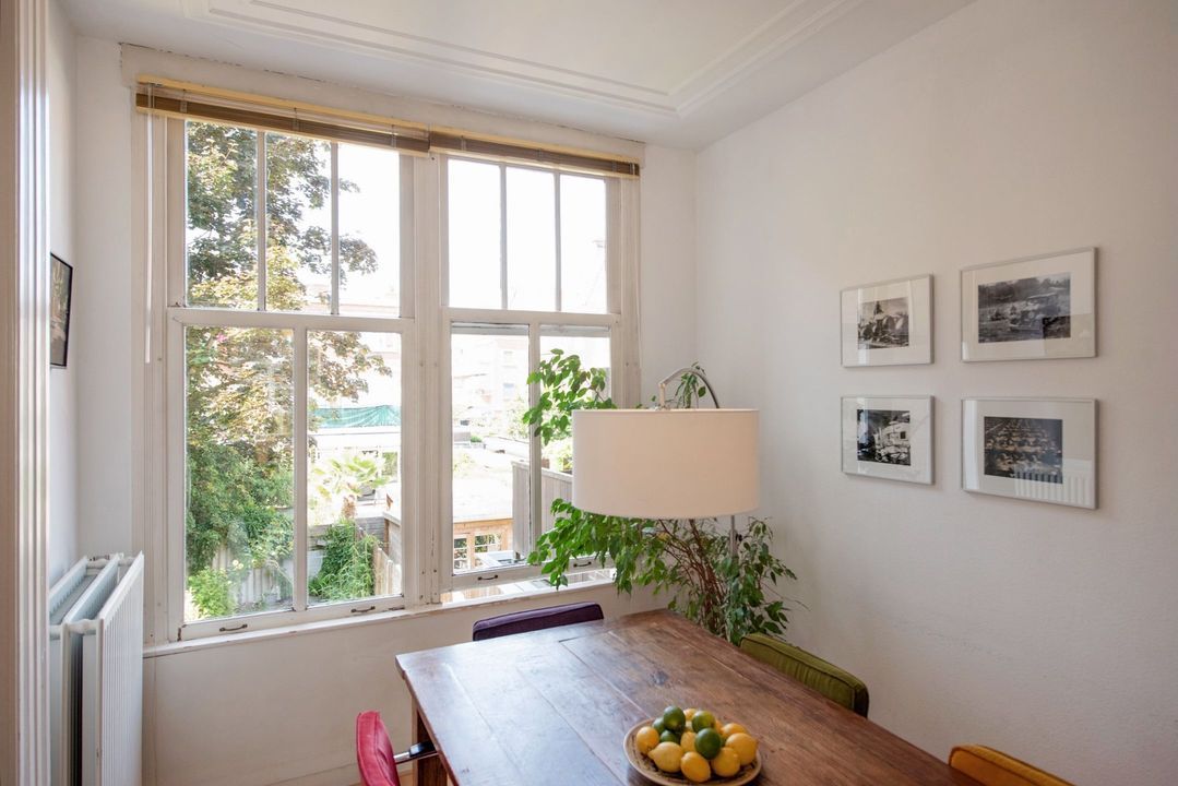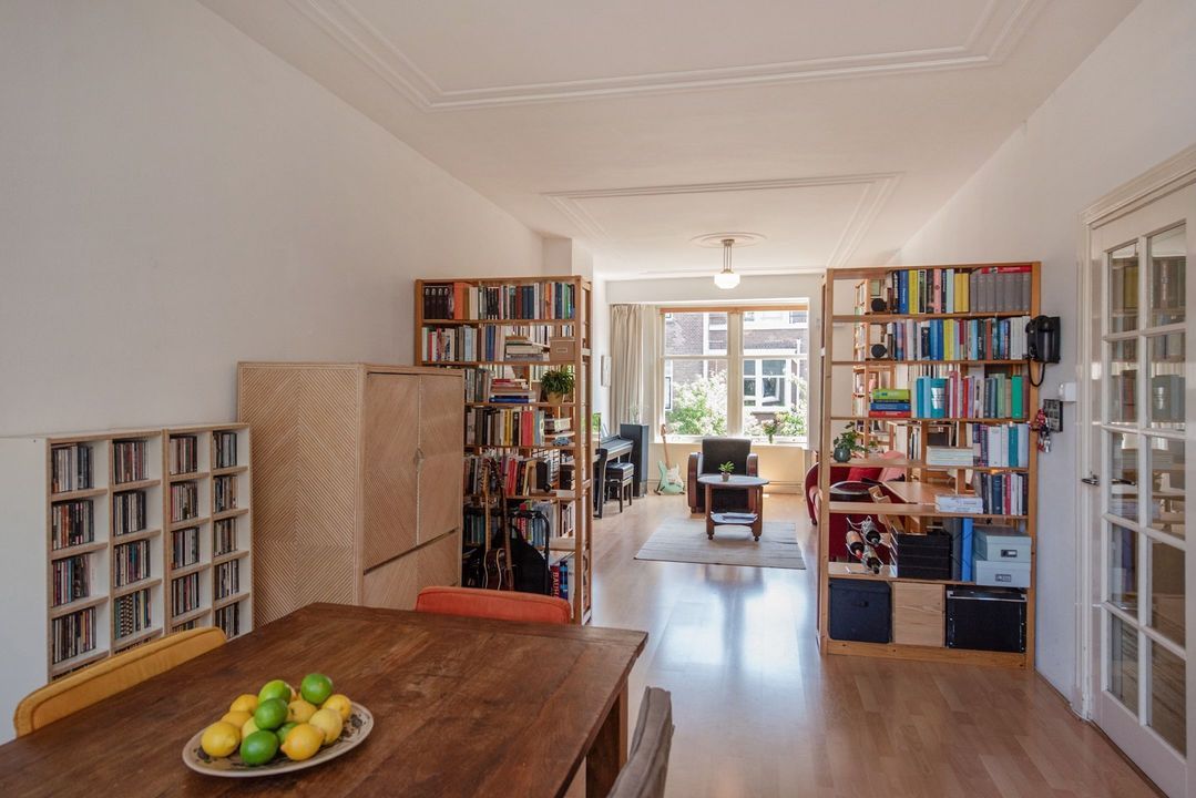 Lichte en sfeervolle woon- eetkamer voorzien van de originele ornamenten plafonds en een hoekschouw. Leuke erker aan de voorzijde met uitzicht in de straat. De dubbele schuiframen in de achterkamer geven uitzicht over het groen van de tuinen.