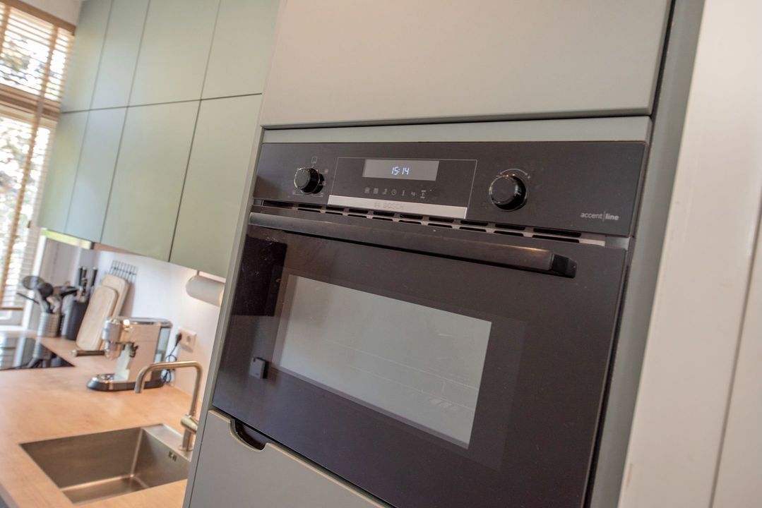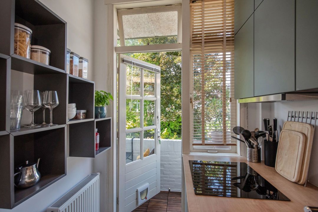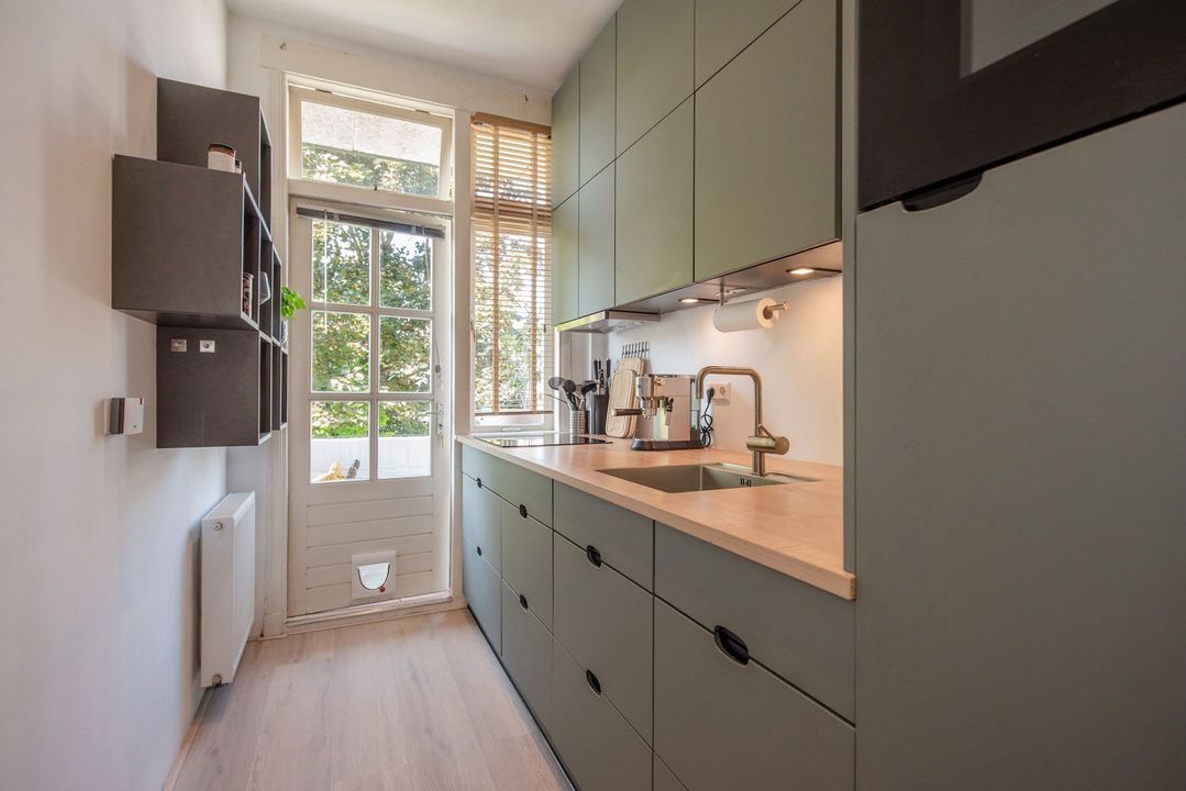 Naast de woonkamer vinden we de moderne en strakke keuken. Deze is in 2022 vernieuwd en heeft een keukenblok in een warme groene kleur met boven- en onderkasten en een extra diep aanrechtblad in beuken dessin. De keuken is vanzelfsprekend voorzien van een inbouw koelkast met vriesvak, een vaatwasser, een inductie kookplaat, een combi oven/magnetron en een vlakscherm afzuigkap. Een genot voor elke kookliefhebber. Vanuit de keuken is het balkon bereikbaar. Met de ligging op noordwest kun je hier aan het einde van de dag nog heerlijk van het zonnetje genieten. De balkonkast geeft de benodigde bergruimte voor potten, stoeltjes of kussentjes.