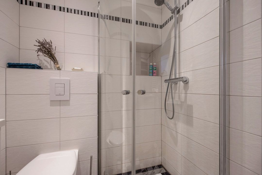 De eerste slaapkamer vinden we naast de keuken. Een prima formaat en met openslaande deuren naar het balkon. Vanuit de gang betreden we de badkamer. Ook deze is in 2022 vernieuwd en beschikt over een wastafelmeubel, een vrijhangend toilet, een ruime douche en de aansluiting voor de wasmachine. Tot slot de tweede slaapkamer, aan de voorzijde met fraaie glas-in-lood bovenlichten en een ruime kastenwand.