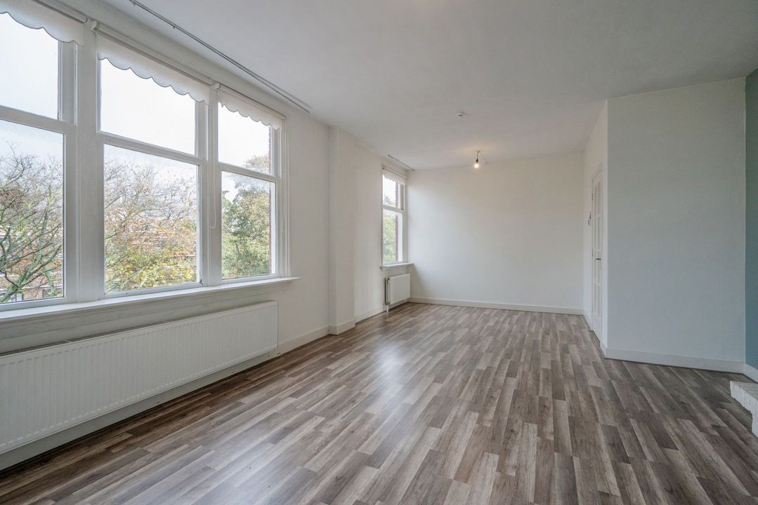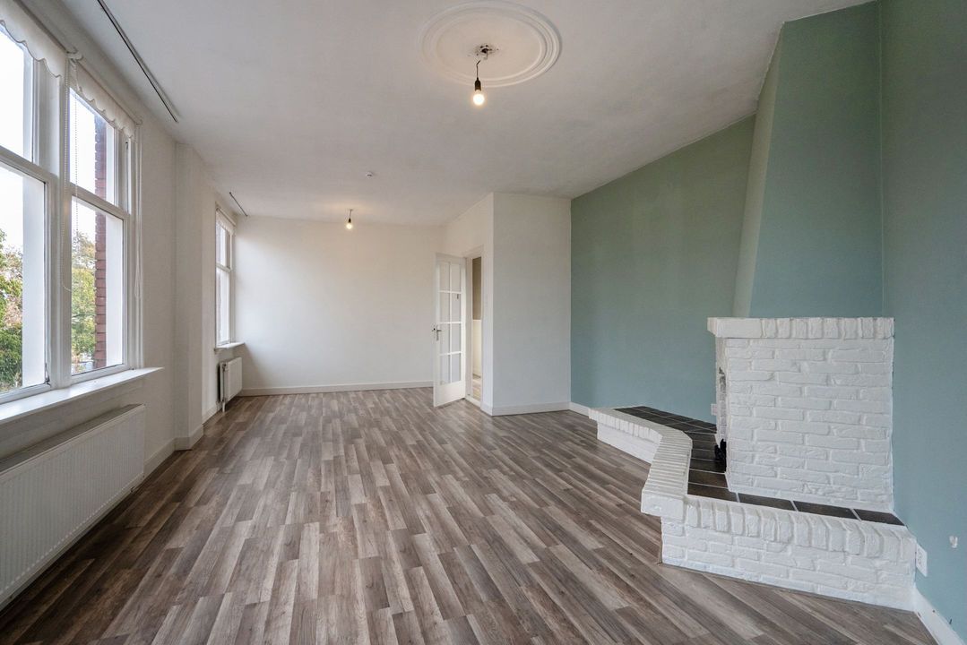 Dan de woonkamer. Deze is ruim en bijzonder van vorm. Met maar liefst 6 ramen is er een zee van licht en vrij uitzicht op de straat en het plein. De woonkamer heeft een grote schouw met open haard.