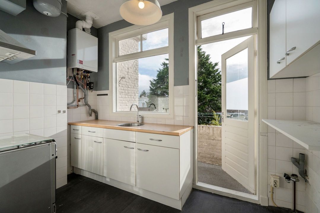 Tot slot de keuken. Deze is voorzien van een eenvoudig keukenblok en een los gasfornuis en afzuigkap. In de keuken bevindt zich de aansluiting voor de wasmachine en de opstelplaats van de c.v.-ketel. Vanuit de keuken toegang tot het balkon.