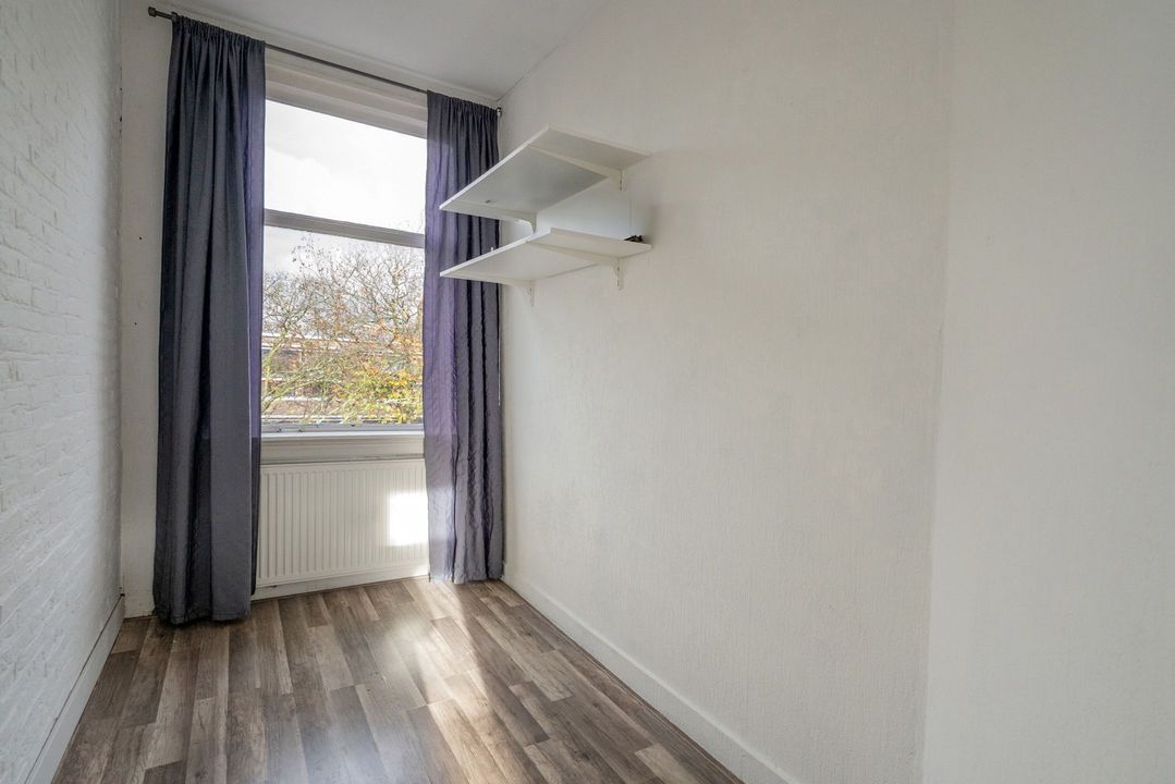 Vervolgens, aan de straatzijde een ruime, bijna vierkante slaapkamer met uitzicht op de straat. Daarnaast een tweede slaapkamer. Deze is iets smaller maar perfect als werk- of kinderkamer.