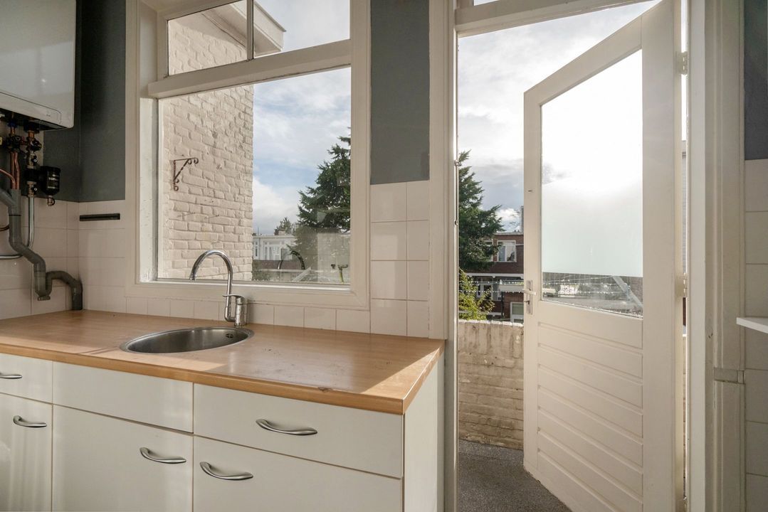 Tot slot de keuken. Deze is voorzien van een eenvoudig keukenblok en een los gasfornuis en afzuigkap. In de keuken bevindt zich de aansluiting voor de wasmachine en de opstelplaats van de c.v.-ketel. Vanuit de keuken toegang tot het balkon.