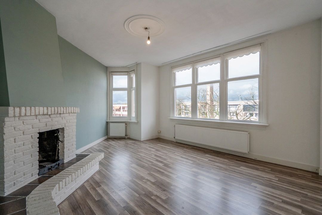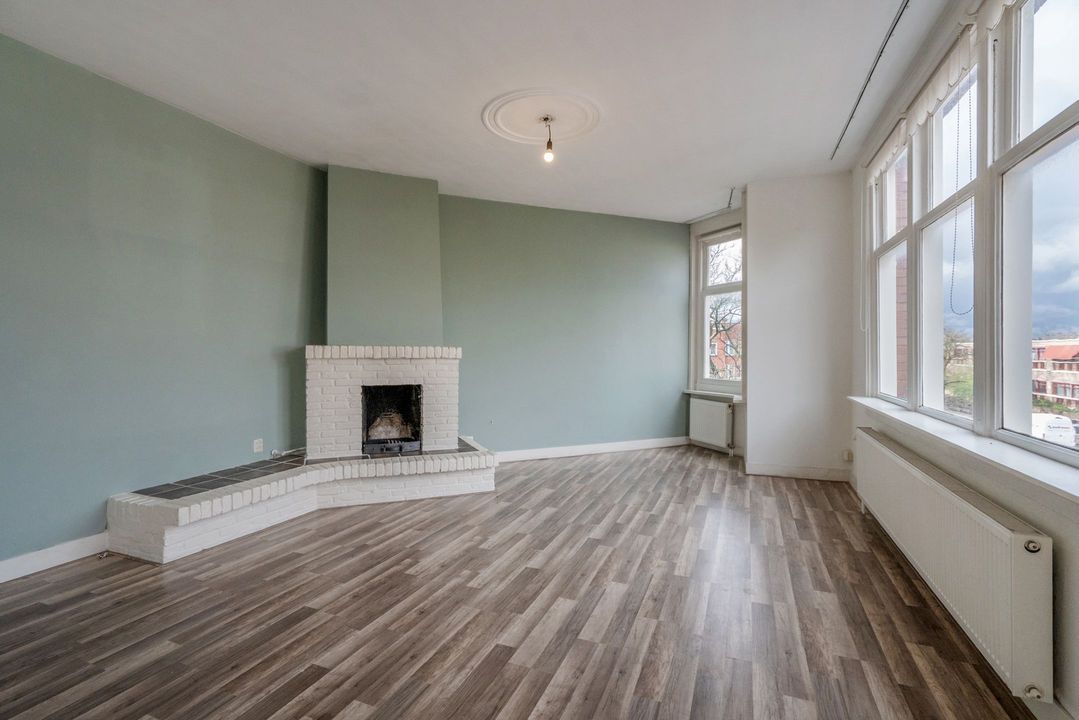 Dan de woonkamer. Deze is ruim en bijzonder van vorm. Met maar liefst 6 ramen is er een zee van licht en vrij uitzicht op de straat en het plein. De woonkamer heeft een grote schouw met open haard.