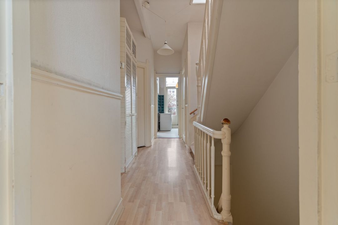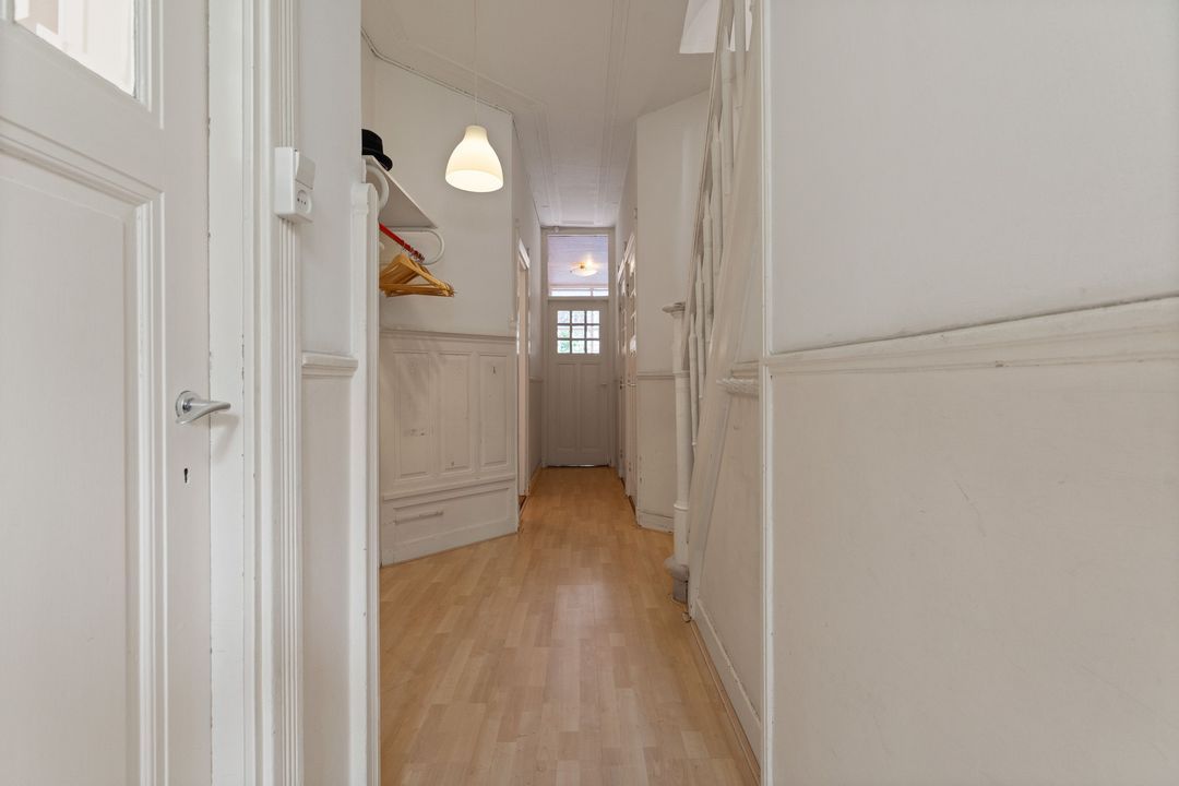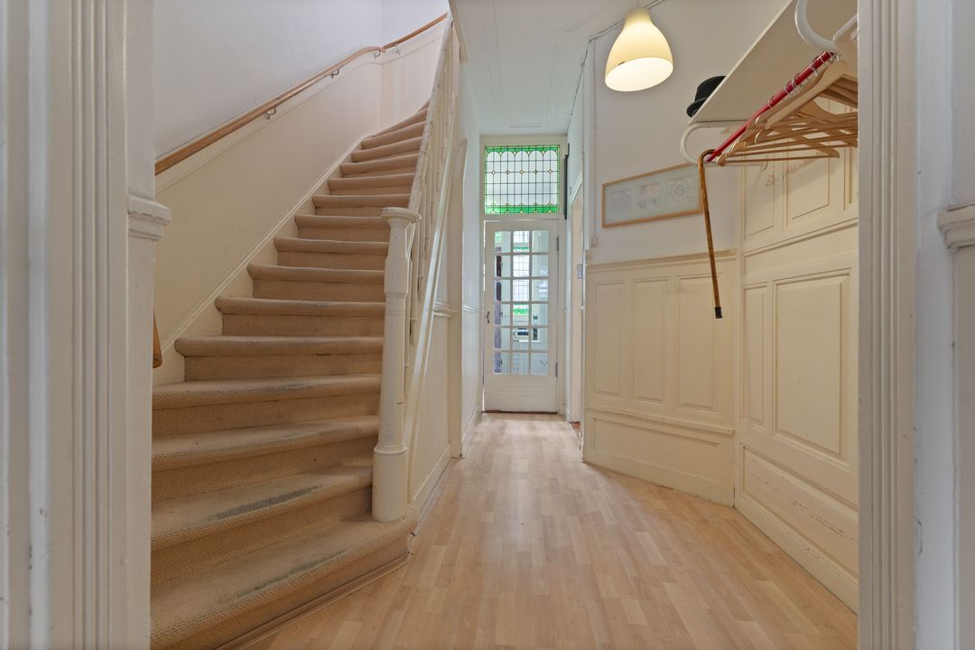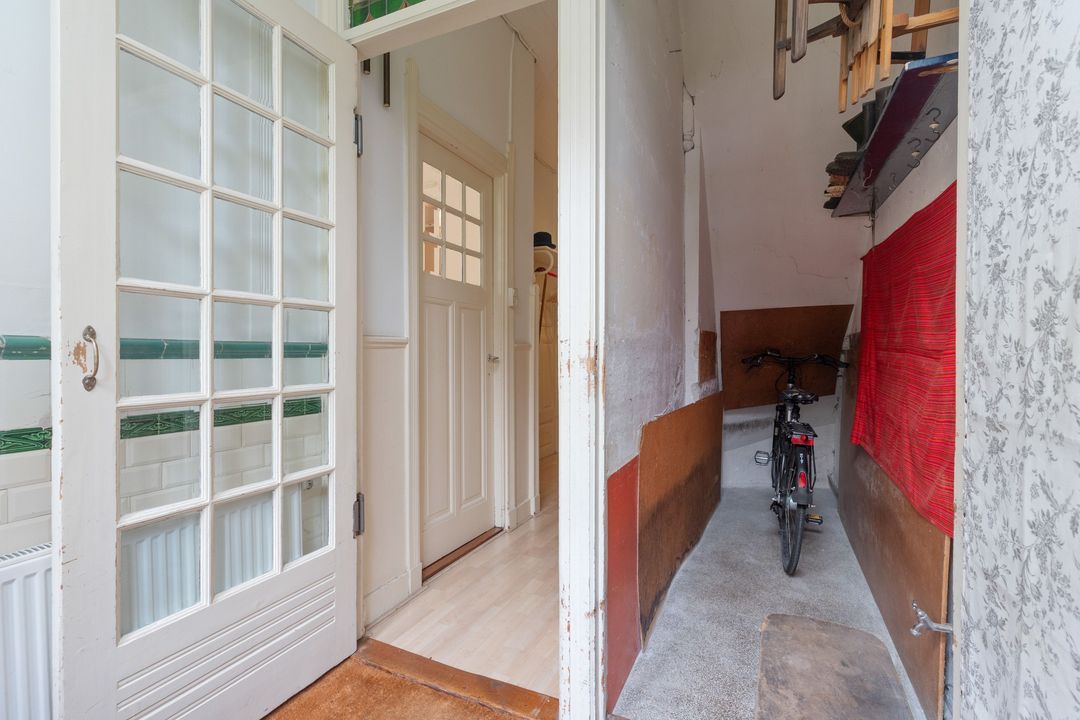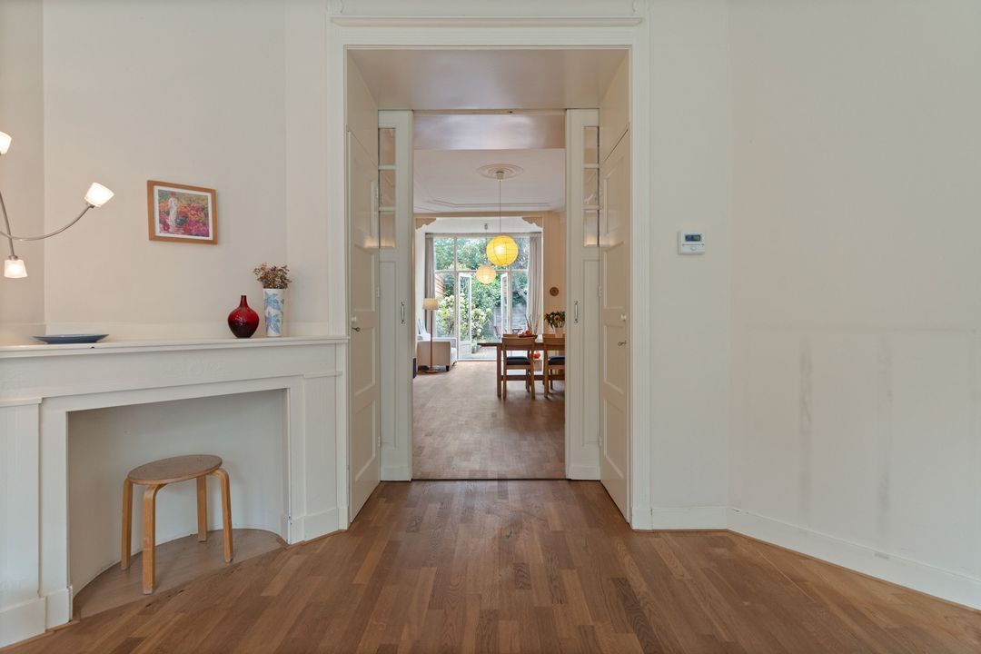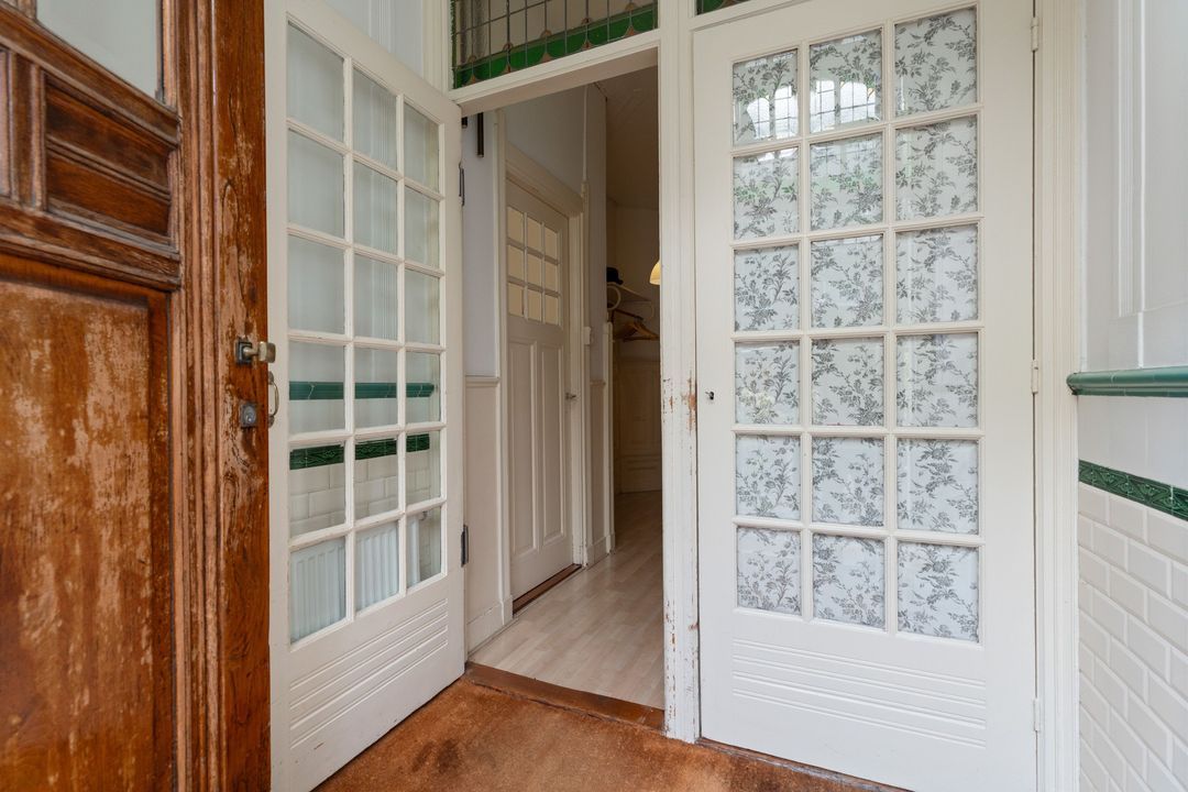Entree, ruime hal met mooie originele lambrisering, fietsenberging, centrale hal met garderobe mogelijkheid. Moderne w.c. met fontein, toegang tot ruime kelder. Ruime nette dichte keuken met opening naar de eetkamer aan de andere zijde en met diverse inbouwapparatuur. Toegang naar de tuin. Woon-/eetkamer met schuifseparatie. De voorkamer heeft openslaande deuren naar de voortuin, een marmeren schoorsteenmantel en glas-in-lood ramen. De achterkamer heeft 3 vaste kasten, plafondlijsten, paneeldeuren met geslepen glas, openslaande deuren naar de achtertuin. Fijne mooi aangelegde tuin met fruitbomen en een stenen schuur.