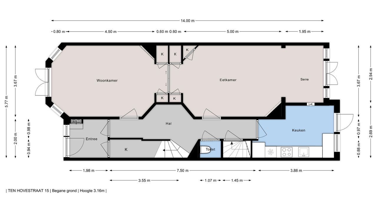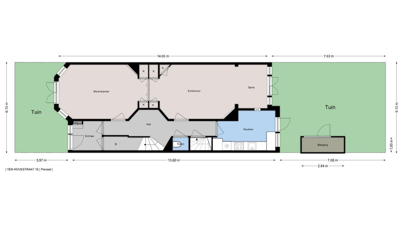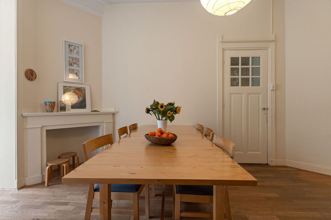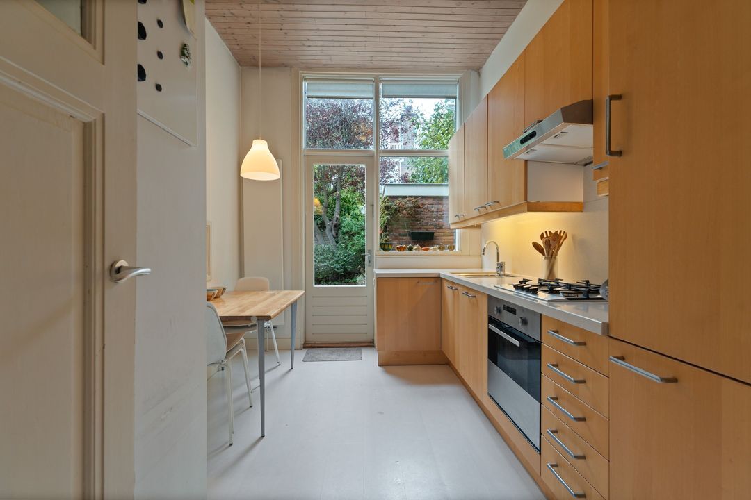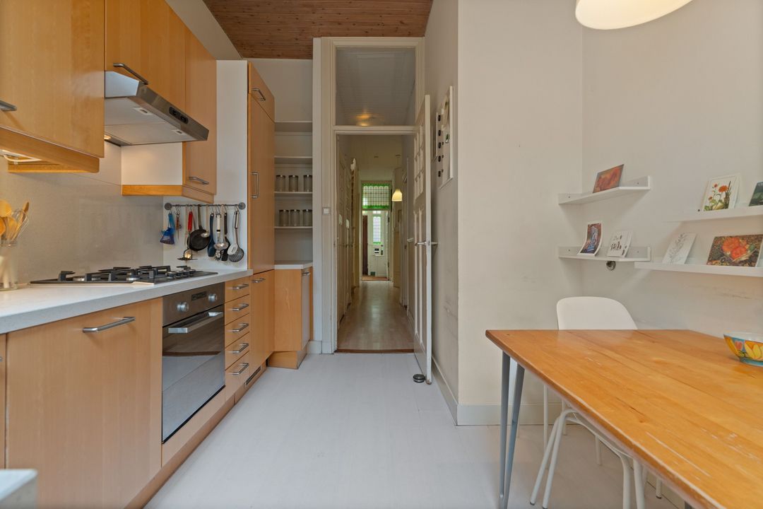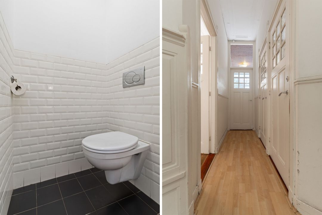 Entree, ruime hal met mooie originele lambrisering, fietsenberging, centrale hal met garderobe mogelijkheid. Moderne w.c. met fontein, toegang tot ruime kelder. Ruime nette dichte keuken met opening naar de eetkamer aan de andere zijde en met diverse inbouwapparatuur. Toegang naar de tuin. Woon-/eetkamer met schuifseparatie. De voorkamer heeft openslaande deuren naar de voortuin, een marmeren schoorsteenmantel en glas-in-lood ramen. De achterkamer heeft 3 vaste kasten, plafondlijsten, paneeldeuren met geslepen glas, openslaande deuren naar de achtertuin. Fijne mooi aangelegde tuin met fruitbomen en een stenen schuur.