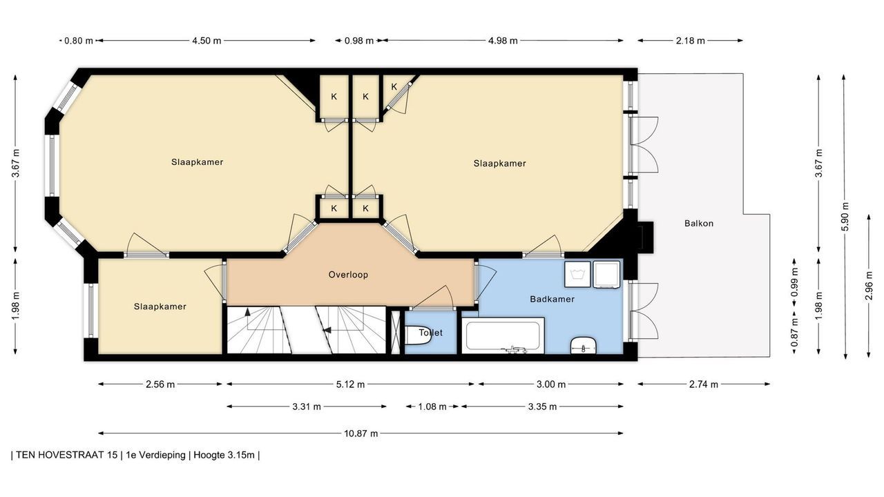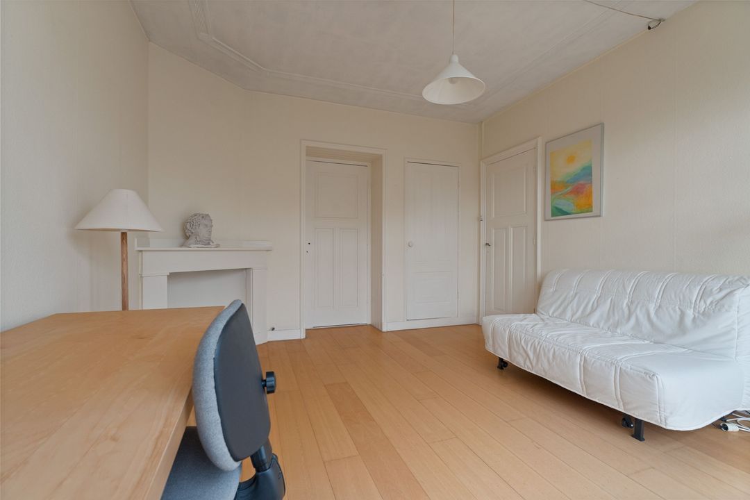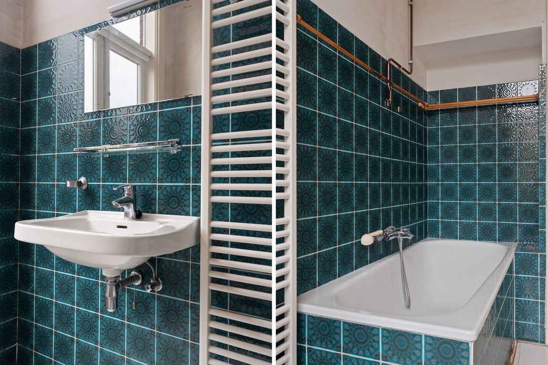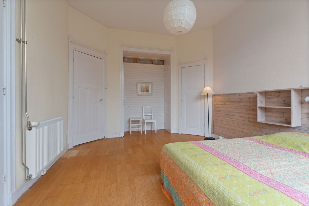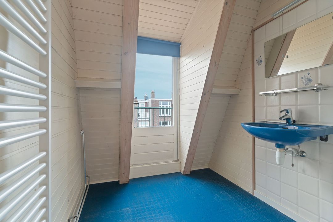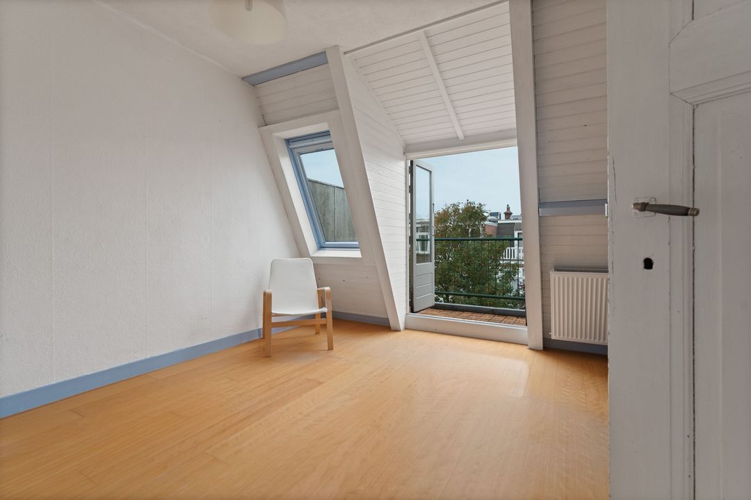 Overloop, voorzijkamer met zeer charmante raampartij, voorkamer met vaste kasten en toegang tot klein voorbalkon. Achterkamer met vaste kasten en openslaande deuren naar achterbalkon. Verouderde badkamer met douche en vaste wastafel, separate verouderde toilet. Opstelplaats c.v.-ketel. Daklicht.