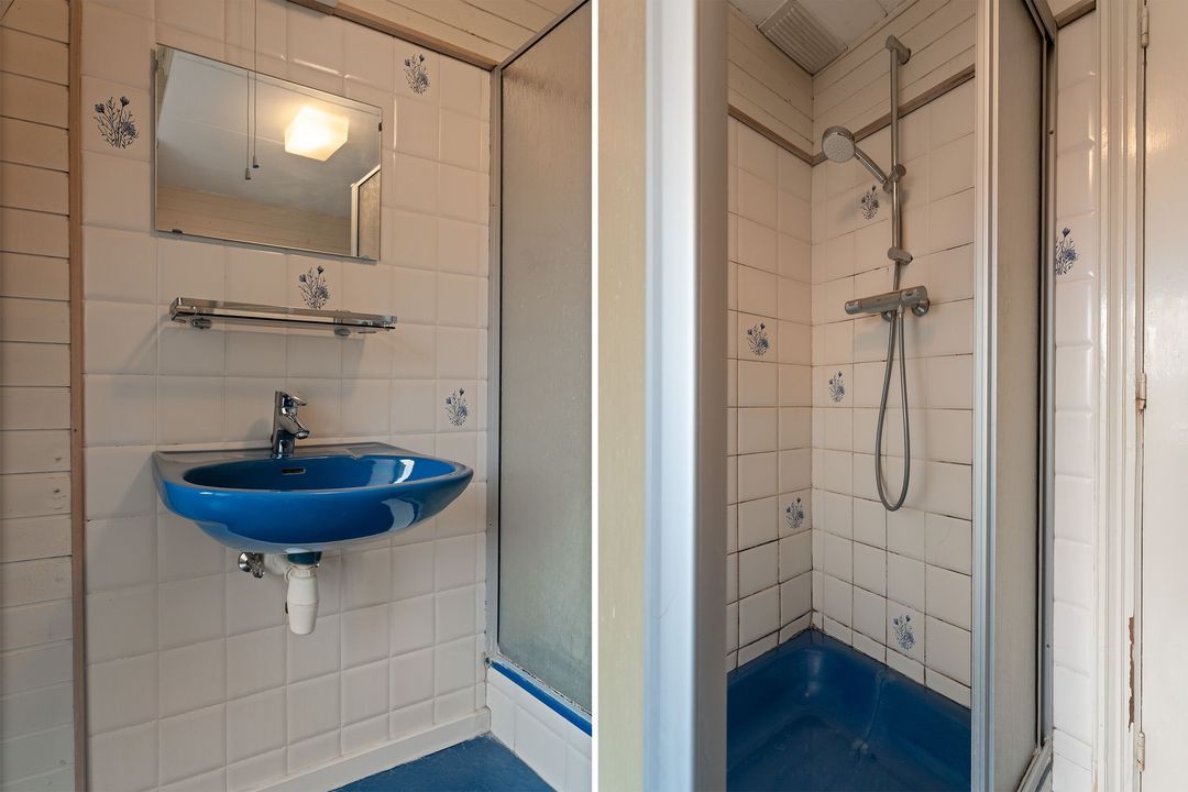 Overloop, voorzijkamer, zeer ruime voorkamer met vaste kasten, schoorsteenmantel, schuifseparatie (nu dicht gemaakt) naar achterkamer met eveneens vaste kasten en schoorsteenmantel en openslaande deuren naar een heel ruim terras. Verouderde badkamer met ligbad, vaste wastafel, wasmachine en droger opstelling. Separate eenvoudige w.c.