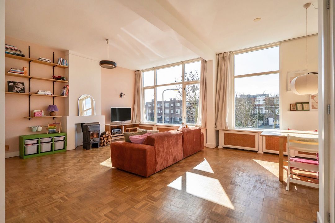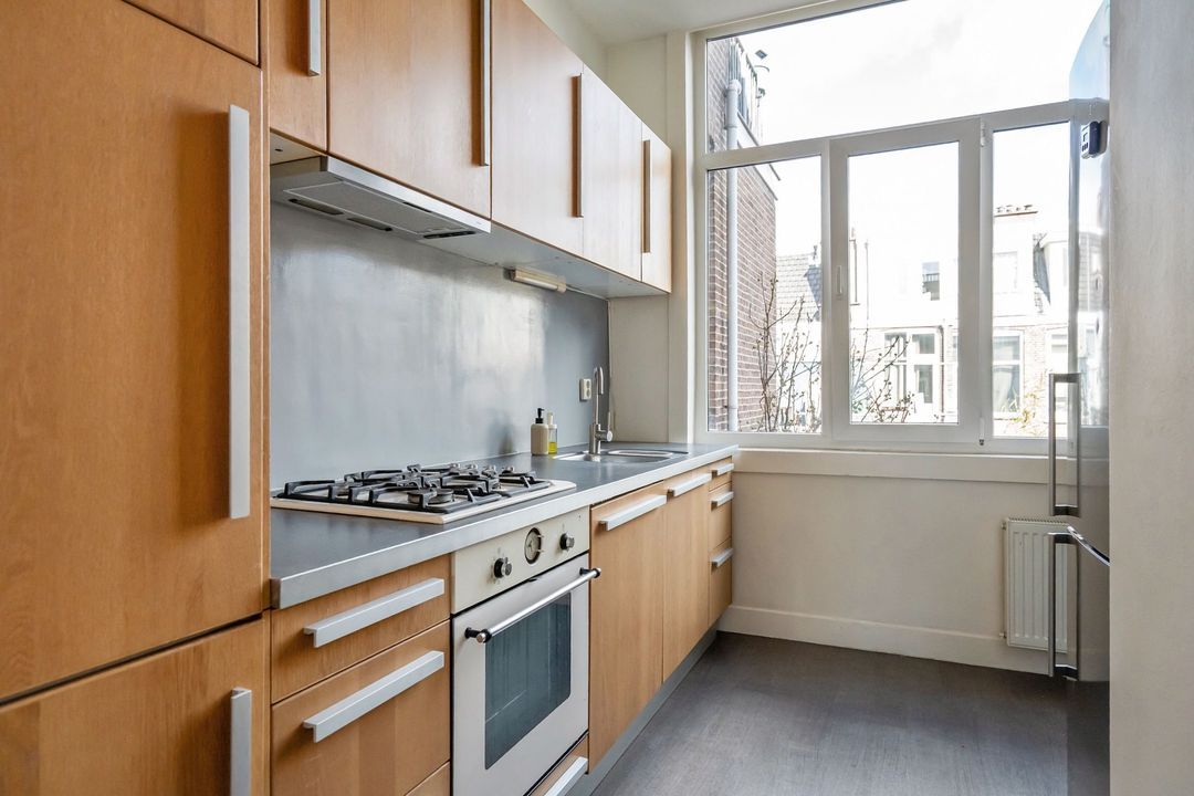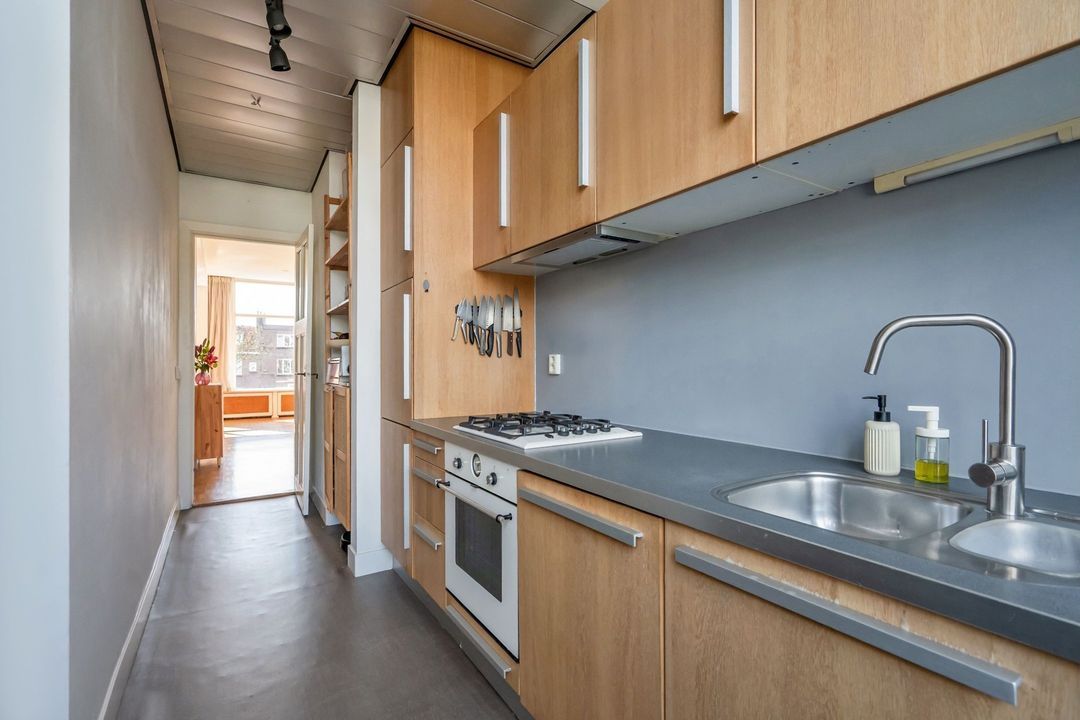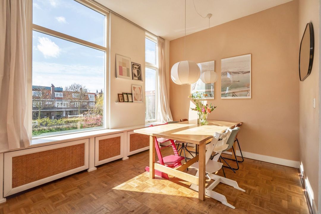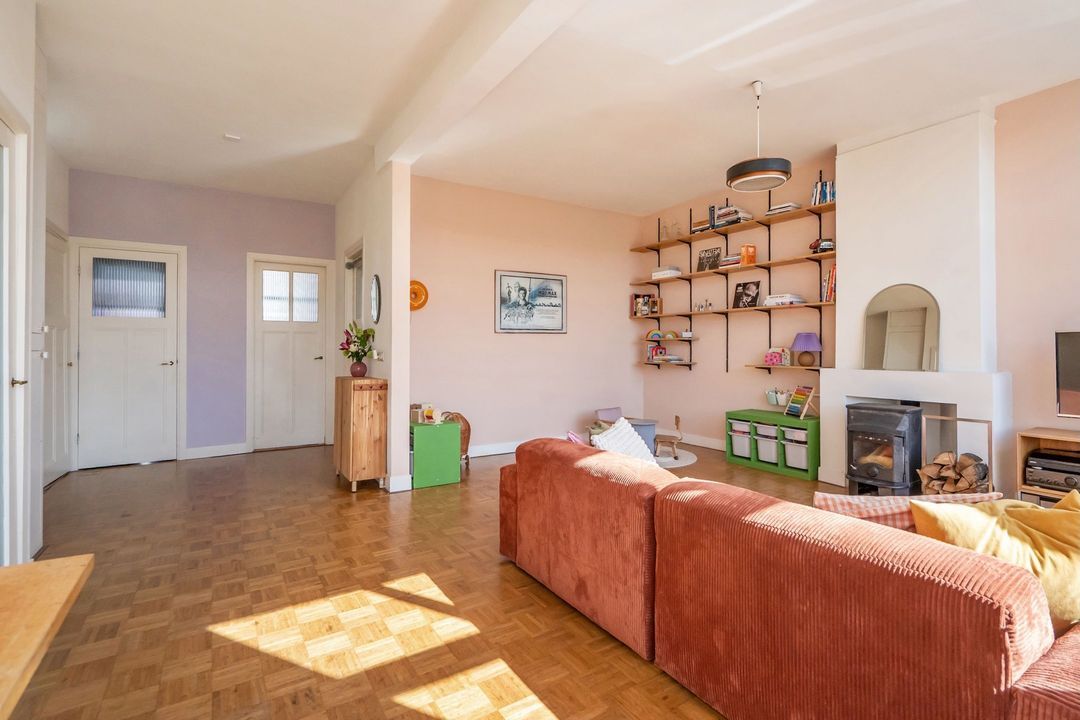 De L-vormige woon- eetkamer is dankzij de ramen over de volle breedte heerlijk licht en biedt een groen uitzicht. De kamer met een loft achtige uitstraling en hoge plafonds is voorzien van een mozaïek parketvloer en een schouw met houtkachel, wat zorgt voor extra sfeer. Door de slimme indeling is er volop ruimte voor zowel een royale zithoek als een aparte eethoek. Er is een diepe bergkast aanwezig en alle deuren zijn originele paneeldeuren. Vanuit de woonkamer loop je zo de keuken in. Het keukenblok met houten fronten en aluminium grepen is uitgerust met een inbouwkookplaat, vlakscherm afzuigkap, oven, inbouwvaatwasser en een losse koel/vriescombinatie. Hier bevindt zich ook de c.v.-combiketel.
