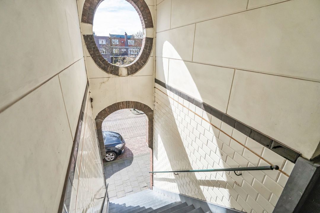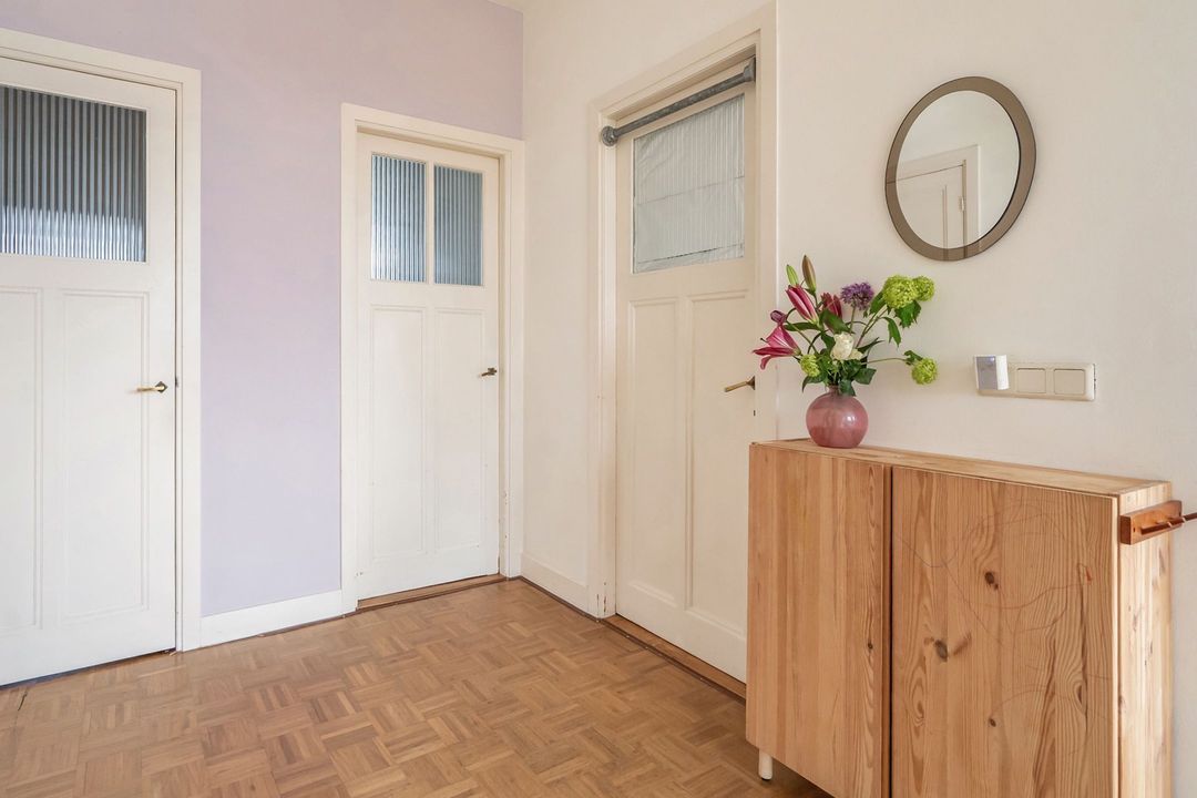 Via een fraai portiek en de trap naar de eerste verdieping bereik je de eigen entree. De hal biedt plek voor jassen en tassen en geeft toegang tot de woon- eetkamer.