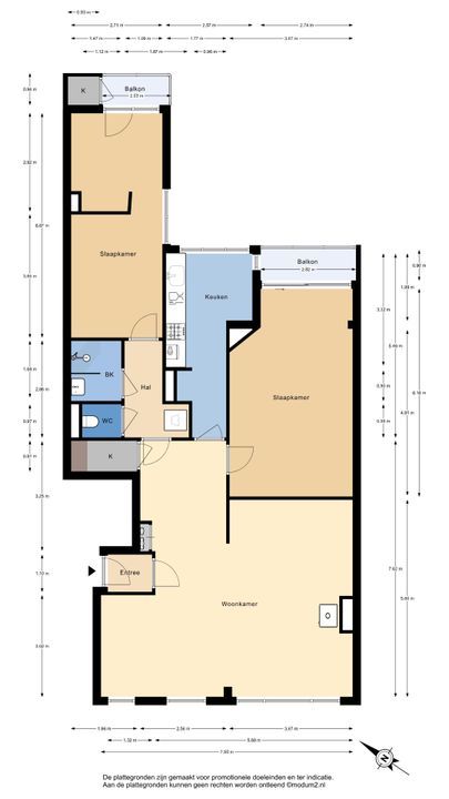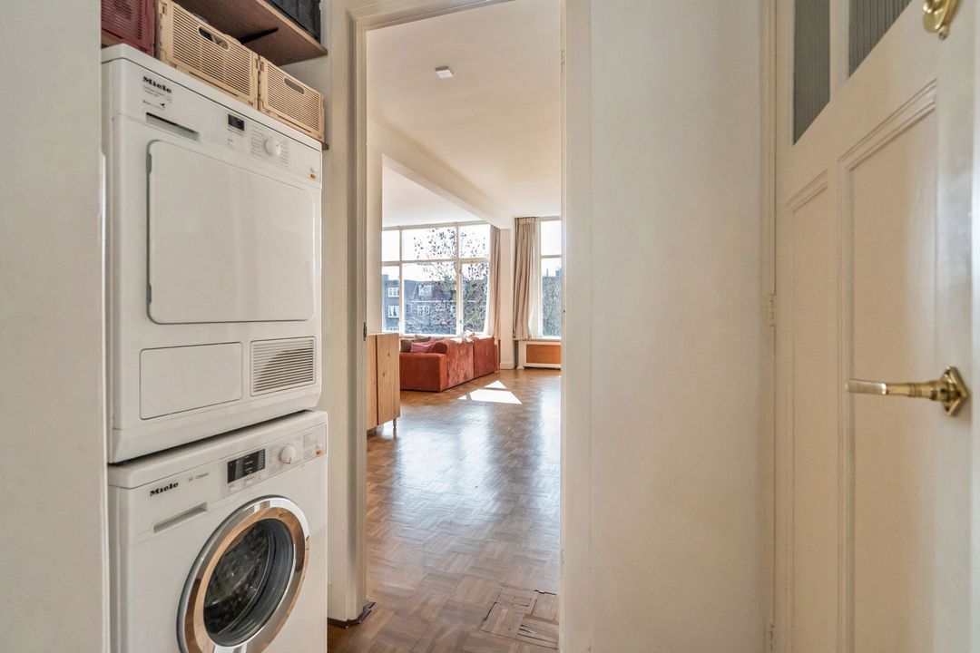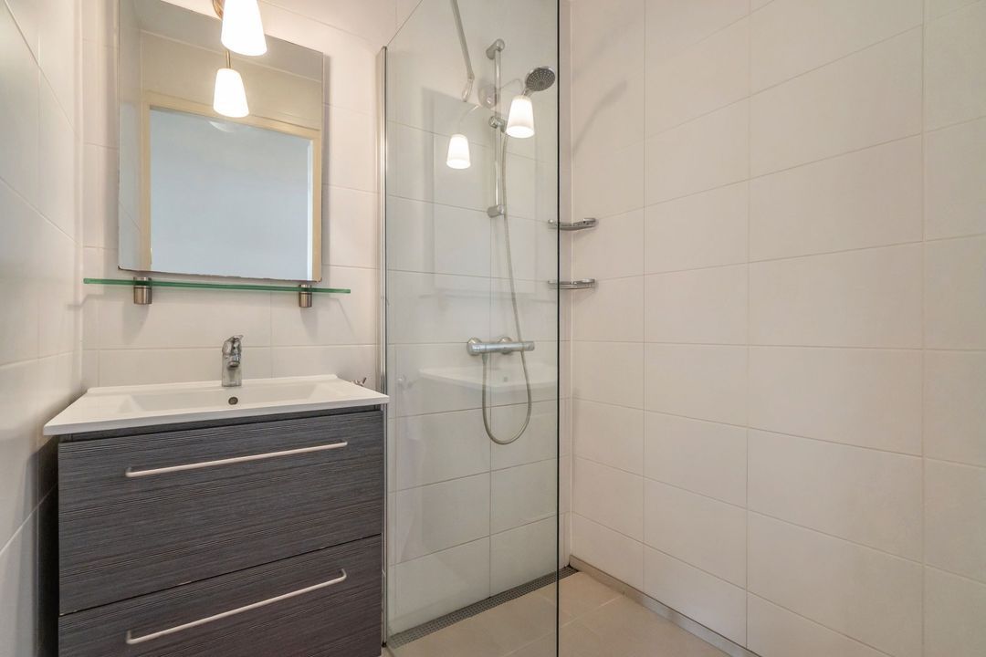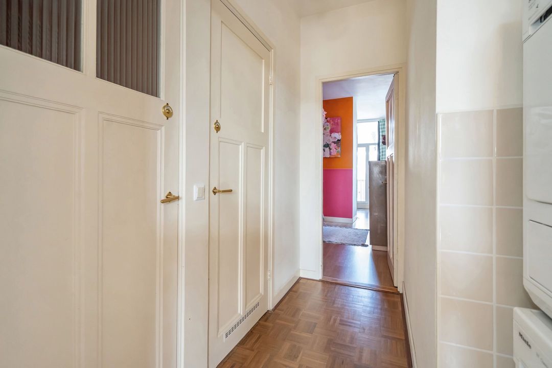 Aan de andere zijde van de keuken bevindt zich een tweede hal met aansluitingen voor wasmachine en droger. Hier vind je ook een moderne toiletruimte en een nette badkamer met wastafelmeubel en inloopdouche. Tot slot is er de tweede slaapkamer van maar liefst 6,70 meter lang. Deze ruimte is eenvoudig op te splitsen in twee kamers. De huidige eigenaren hebben dit opgelost met een kast, maar een vaste wand is uiteraard ook mogelijk. Vanuit deze kamer heb je toegang tot het tweede balkon, inclusief een handige balkonkast.