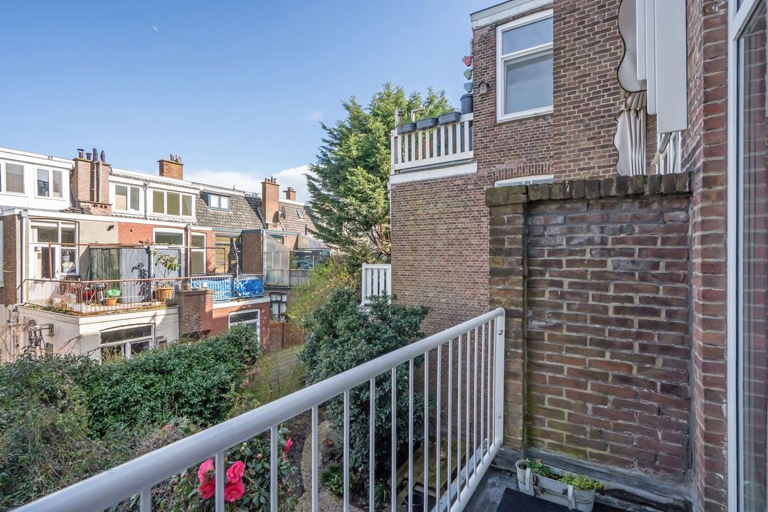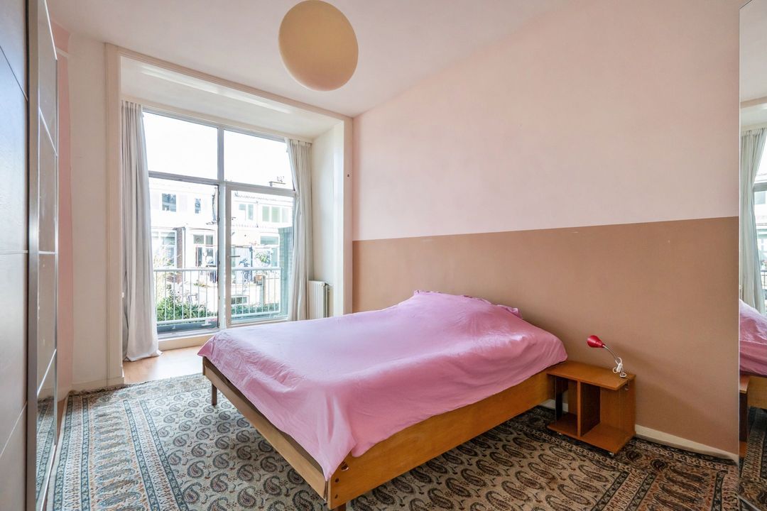 Naast de keuken ligt de zeer ruime hoofdslaapkamer. Groot genoeg voor een tweepersoonsbed, een flinke kledingkast en zelfs een extra zitje. Via de schuifdeuren stap je het eerste achterbalkon op, met uitzicht over de groene tuinen.