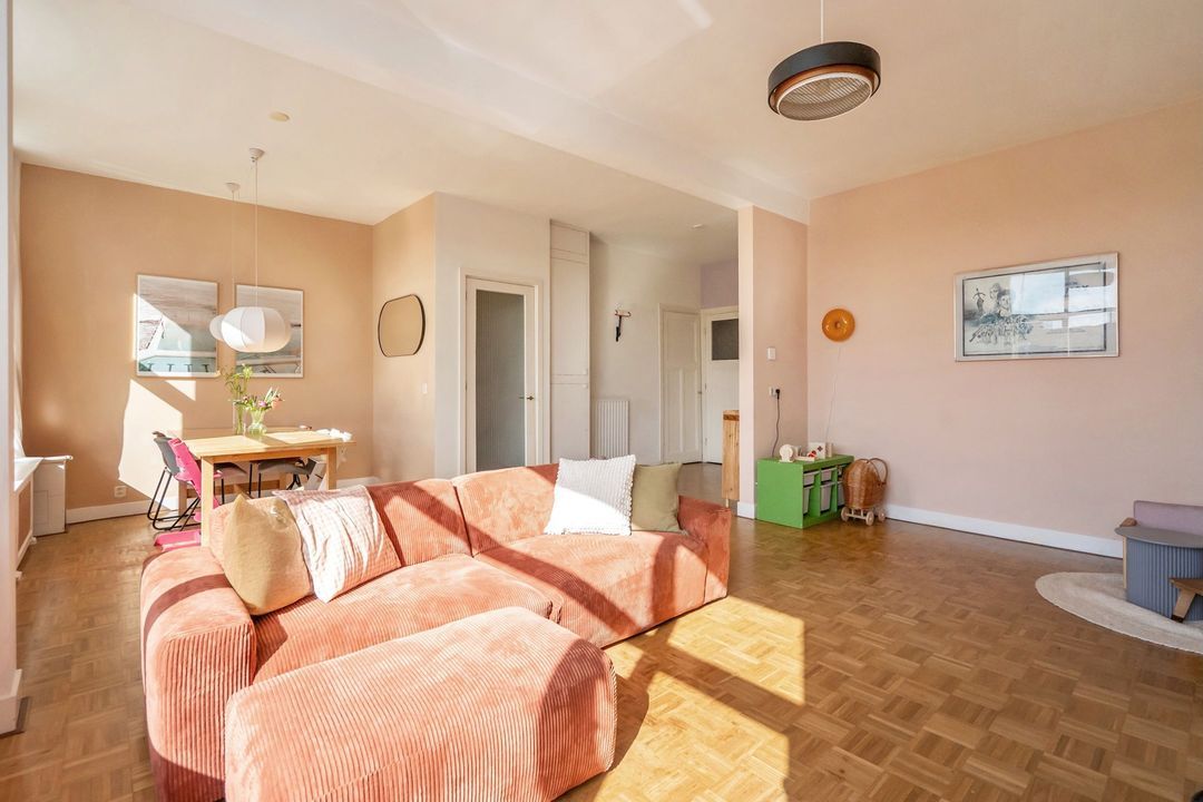Woonkamer met mozaïek parketvloer, slaapkamers met laminaat.