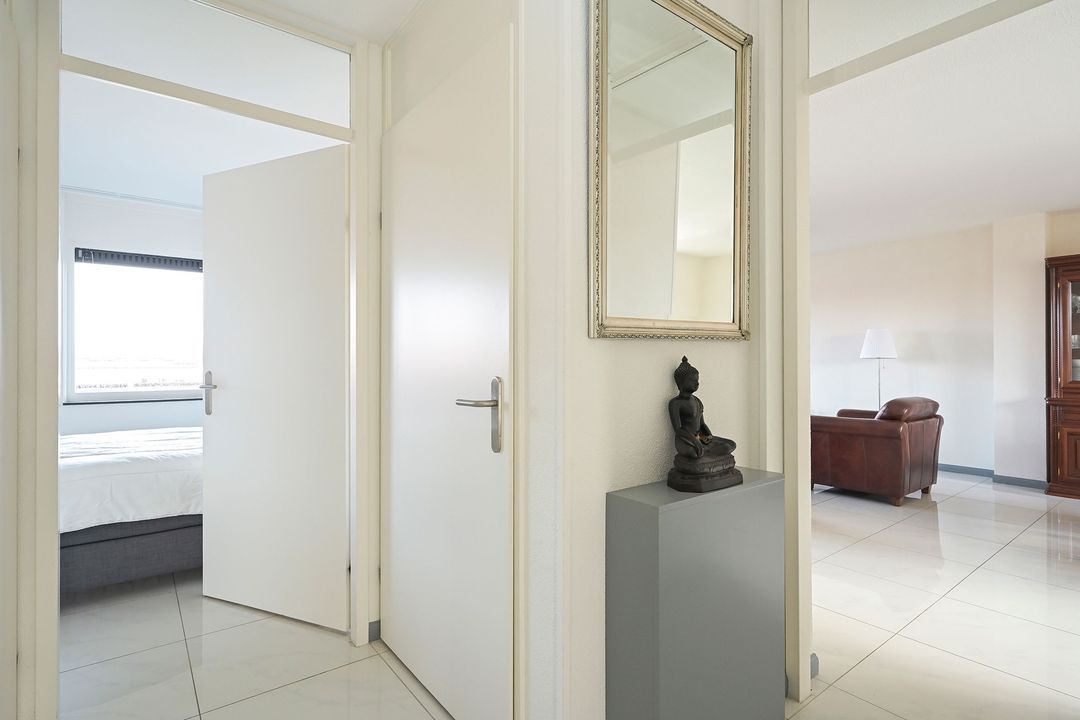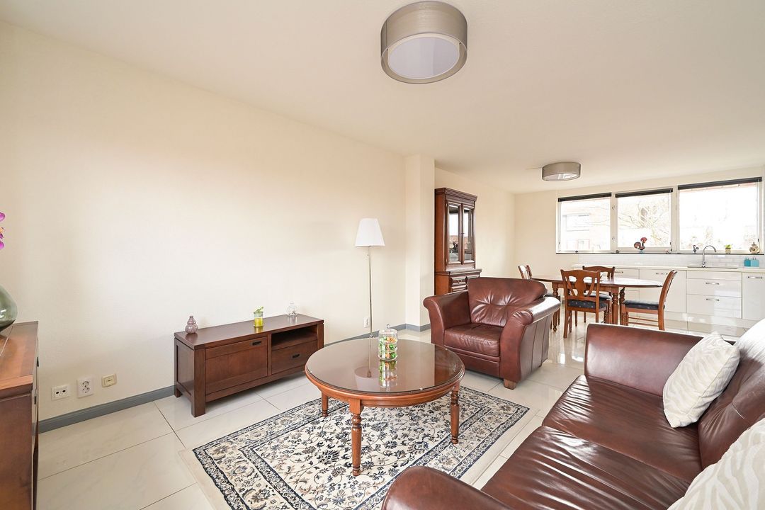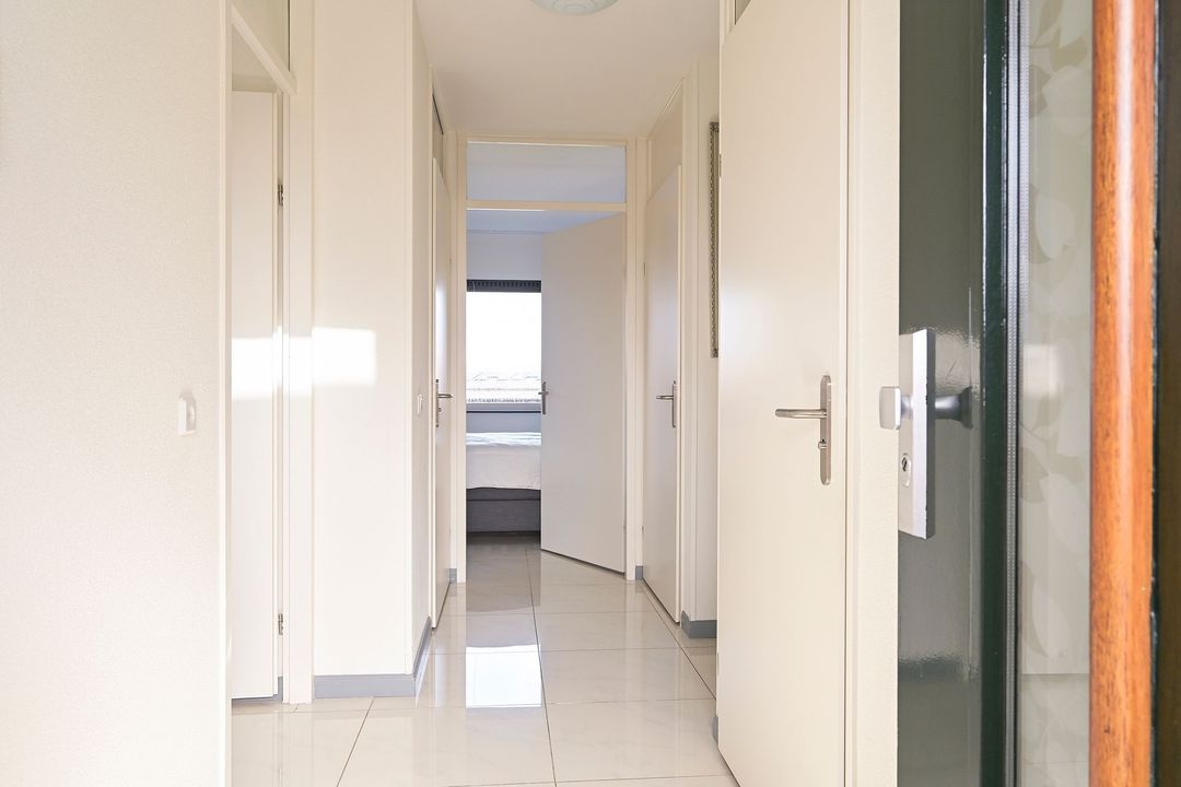 De woning is nagenoeg geheel voorzien van witte plavuizen, met vloerverwarming in de hal en de woonkamer. De moderne badkamer en toiletruimte uitgevoerd in eveneens lichte tinten, geven de woning een frisse uitstraling. De open keuken in hoekopstelling beschikt over diverse inbouwapparatuur. De badkamer is volledig betegeld en voorzien van een inloopdouche, wastafelmeubel, designradiator en opstelplaats voor wasmachine en droger. Beide slaapkamers zijn voorzien van plavuizen en radiatorverwarming.
